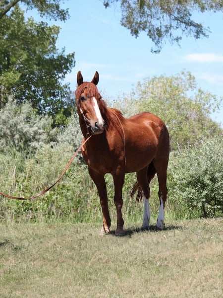 "AVAILABLE ON ONLINE HORSE AUCTION AT www DOT MagicHorseAuction DOT com BIDDING OPEN NOW thru TUESDAY | JULY 22nd - BUY IT NOW AVAILABLE! *Final price will be determined on auction site* CONSIGNOR CONTACT INFO: Dynamite Horses 970-632-3644 LOCATION: Fort Collins, CO ★★ CANDY CANE ★★ 2011 Sorrel Mustang Gelding | Flashy Chrome | Seasoned Trail Horse with Personality Candy Cane is a 2011 sorrel mustang gelding with plenty of chrome and a larger-than-life personality. He’s the kind of horse that turns heads and wins hearts wherever he goes. Energetic, enthusiastic, and full of character, Candy Cane is a true all-around partner who’s always ready for the next adventure. He absolutely loves having a job and is happiest when he’s working. With his great motor and forward-thinking attitude, Candy Cane is the type of horse that can go all day and still be eager for more. He’s been used extensively on the trail and has proven to be reliable in a wide variety of settings. Whether you’re riding alone or in a group, he’s confident, surefooted, and steady. He’s even ridden straight through downtown Fort Collins without batting an eye — completely unfazed by traffic, bikes, strollers, dogs, pedestrians, or crowds. In the arena, Candy Cane has a solid foundation. He knows his leads, stops off voice cues, performs a smooth rollback into the rail, and carries a comfortable, slow jog. He’s also been ridden English and bareback, showing his versatility and easygoing nature. Whether you’re headed into the hills or warming up in the ring, he’s ready to meet the moment. Candy Cane has been exposed to a wide range of obstacles and activities. He’s carried a flag, crossed tarps without hesitation, been hitched to pull a wagon, and even gone swimming. His boldness and curiosity make him a joy to ride in unfamiliar settings, and he handles new experiences with enthusiasm. He’s also incredibly personable on the ground. Candy Cane is easy to catch, enjoys being bathed, and thrives on attention. He’s got a goofy, affectionate personality and thinks every horse is his new best friend. He doesn’t need to be lunged before riding — just saddle up and go. Candy Cane is truly a one-of-a-kind gelding with heart, ability, and a personality that keeps things fun. If you’re looking for a horse that’s trail seasoned, versatile, and full of character, he’s ready to be your next partner. Feel free to reach out with any questions or to schedule a time to come meet this sweet and spirited guy. His video is available to watch — don’t miss the chance to see him in action.