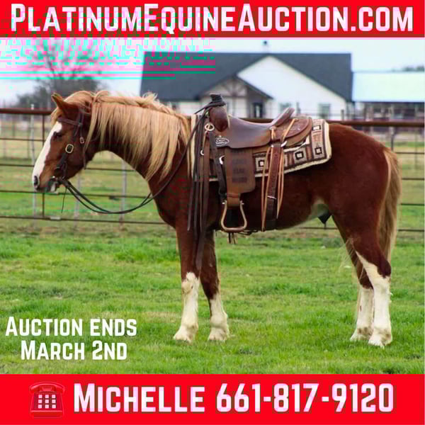 ONLINE AUCTION Place your bids at www.PlatinumEquineAuction.com Starting Bid $3500 Auction ends March 2nd, 2025 Need a new saddle? Check out White Rock Saddles on our website or Facebook! Here’s your chance to own a piece of American History! Meet Tomahawk, a charming 4-year-old branded mustang gelding who stands at a perfect 14.0 hands tall. With all the beautiful chrome you could ever want, he’s not just a looker—he’s a sweetheart too! Tomahawk has the kind of easy-going personality that makes him a joy to be around. Always eager to please and ready to learn new skills, he’s the perfect partner for anyone looking to bond with a horse and grow with. Tomahawk has had an excellent start and has been exposed to a variety of experiences. He’s been used weekly to pen back cattle at the sale barn and bring up roping steers at the practice pen. His skills include walk, trot, and loping circles, and he’s soft in the face, breaking at the pole nicely. Whether you’re riding down the trails or taking a stroll through town, Tomahawk is up for the adventure! This gentle guy is ready to find his lifelong partner—could that be you? He’s also gentle enough for a handy kid looking to train their next winner, making him a fantastic choice for aspiring young riders. Need help with transport? No worries at all! We have a list of reputable haulers who can get Tomahawk safely to your doorstep, whether you’re in Alaska, Mexico, Hawaii, Canada, or anywhere in between. Don’t miss out on this incredible opportunity to bring Tomahawk into your life! Located in Stephenville, TX. Contact M $ Performance Horses Michelle 661-817-9120. ONLINE AUCTION Place your bids at www.PlatinumEquineAuction.com Starting Bid $3500 Auction ends March 2nd, 2025 Need a new saddle? Check out White Rock Saddles on our website or Facebook!