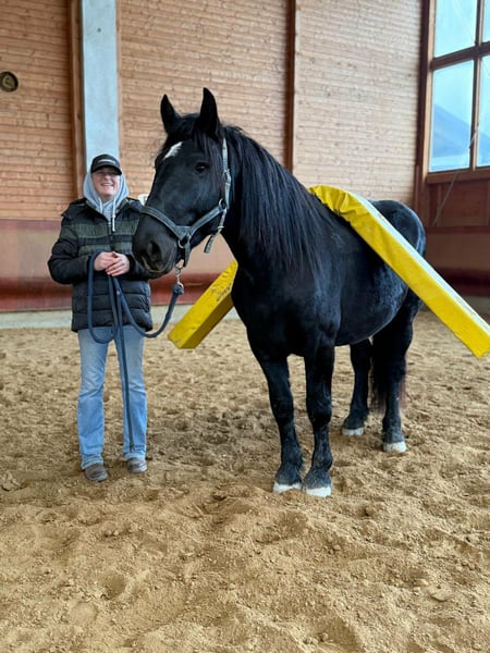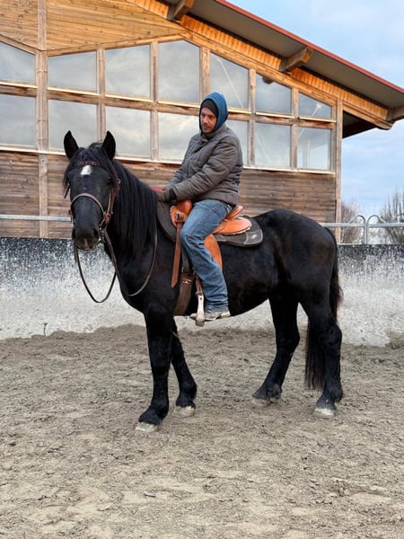 Braver, junger Noriker-Wallach (Rappe), 3 Jahre, 1.60m, angeritten, Almaufzucht. Ideal als Freizeit- und Wanderpferd. Es gibt Pferde, die man vom ersten Moment an ins Herz schließt: klar im Kopf und freundlich im Wesen. Dieser bildschöne Noriker-Wallach in Rappfarbe bringt genau das mit. Ein freundlicher Charakter und ausgestattet mit leichten Bewegungen, macht er schon jetzt beim anreiten eine sehr gute Figur. Er wird zur Zeit schonend und altersgerecht angeritten und ist dabei Mega anständig. Er wird vom Profi solide angeritten, longiert und ist brav unter dem Sattel. Durch seine Trittsicherheit geeignet für Freizeit-und Wanderreiter sowie durchaus auch für ambitionierte Freizeitreiter die mehr möchten, da er ein leichter Typ ist und schöne lockere Bewegungen mitbringt. Aufgewachsen im schönen Kärnten auf der Alm, kennt Kühe, Tourismus und alles, was sich am Berg bewegt. Bei uns hat er zusätzlich Traktoren, Hunde, Hühner und viel Weiteres kennengelernt. Er ist freundlich, aufmerksam und unkompliziert. Mit anderen Pferden geht er sehr lieb um und ist verträglich mit allen anderen Vierbeinern. Mit weiterer Ausbildung wird er der perfekter Partner für schöne Ausritte und mehr. • schmiedefromm, verladefromm • gesund, gut bemuskelt, ekzemfrei • Papiere/Zubehör: Equidenpass aus dem Original-Zuchtgebiet vorhanden. Neuer passender bequemer Westernsattel kann auf Wunsch miterworben werden. Auf der Alm lernt man Gelassenheit: Unser Noriker hat Berge, Wetter, Vieh und Trubel kennengelernt , beste Schule für ein verlässliches Freizeitpferd. Er ist freundlich und aufmerksam, lässt sich dem Ausbildungsstand entsprechend brav reiten und macht es seinem Menschen leicht, schnell Vertrauen zu fassen. Wer sich ein komfortables, hübsches Pferd mit Herz sucht, wird ihn lieben. Bei aufrichtigem Interesse rufen Sie gerne unter 01709343872 an. Auf Wunsch kann er gerne noch zur weiteren Ausbildung bleiben. Eine gute Beratung für unsere Kunden liegt uns sehr am Herzen. Daher planen Sie für einen Besuchstermin mit Vorreiten und Probereiten 1-2 Stunden ein. Für das erste Pferd berechnen wir 35€ , jedes weitere Pferd 20€. Hierfür bitten wir um Verständnis.