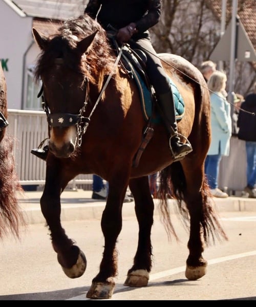 We are looking for a suitable permanent home for our 6-year-old Noriker gelding, Ramiro. Ramiro is a striking horse in the rare liver-tiger coloring. He has had a calm upbringing and was recently started under saddle with gentle groundwork. As a result, he has a solid foundation and is motivated and eager to learn during training sessions. Whether in the field in a group, during ground work, or at clinics such as Working Equitation – he participates well everywhere and consistently shows attentiveness and good manners. Ramiro is not a beginner’s horse and requires a rider who can provide him with confidence and security. With proper guidance, he will develop into a reliable partner. In daily handling, he is straightforward: he is easy to load, familiar with everyday routines and outings, and currently lives in a pasture turnout with a mixed herd, where he gets along very well with others. He has also traveled to competitions and remained calm and relaxed throughout. He is currently shod in front. Ramiro is a young horse with a good foundation, ready to be further developed and promoted. We will only place him in responsible and suitable hands.