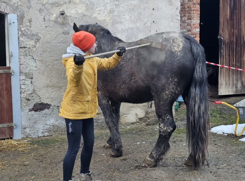 I am selling my heavy-hearted to my Noriker gelding Fabio due to lack of time. He was born in April 2019 and stands 17.2 hands high. Fabio is already backed and has been ridden mainly in the terrain in all three gaits. When properly exercised, he is a willing learner, calm, relaxed, and has a strong personality. He is familiar with ground work based on Horsemanship principles. However, I haven't been able to give him the attention he deserves during the colder months, as I lack an indoor riding arena or riding surface where I could work with him. Therefore, I have decided that our paths must part. Fabio needs a consistent owner who is fair, as he can be quite sensitive. Without clear boundaries and regular work, he tends to test his limits. He is not suitable for beginners. In experienced hands, he has a lot of potential. He would also be very happy in a home where he can be ridden regularly. Currently, he stays in a box at night and is turned out during the day, but he is also accustomed to living in an open stable.