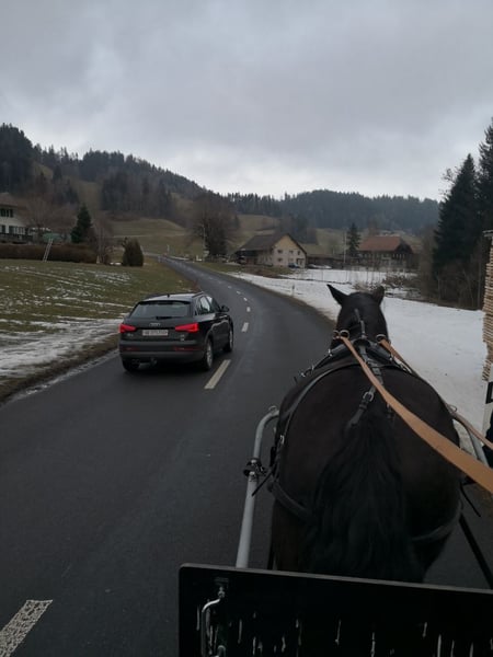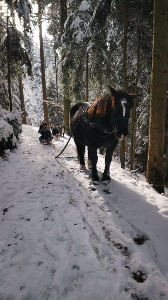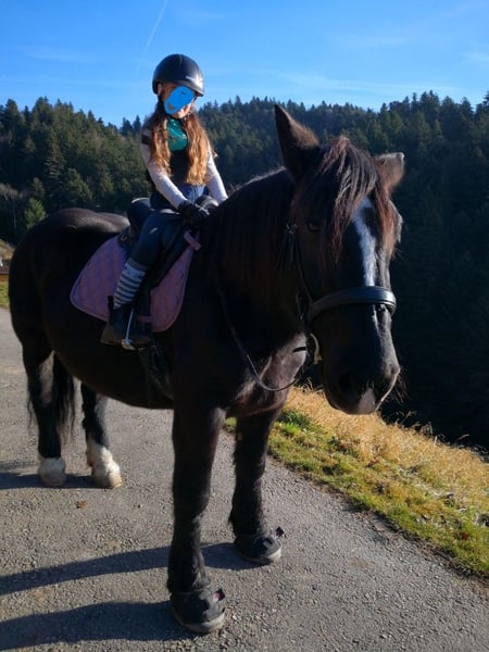 Larissa ist 11 Jahre alt und 159 cm. Laute Maschinen, Baustellen, Kühe, Traktoren, schreiende Kinder oder bellende Hunde, das lässt sie alles völlig kalt. Die Norikerstute kann auch von wenig erfahrenen Reitern geritten werden. Auch bestens geeignet für schwere Reiter. Sie liebt alle Arbeiten mit ihrem Kumt. Dabei zeigt sie sich stets engagiert, nervenstark und verkehrssicher. Bei ihrem Erstbesitzer = Züchter wurde sie 2-Spännig gefahren, dabei kann sie links oder rechts eingespannt werden. Ausserdem war sie für Touristen und einige Male als Rückepferd im Einsatz und ist auch an Festumzügen mitgelaufen. Auch geritten wurde sie. Seit sie bei uns ist (seit 2 Jahren), wird sie vor allem im Gelände geritten. Als Kutscheranfänger haben wir bis anhin ein halbes Duzend Kutschfahrten mit ihr unternommen und sehr genossen. Dabei fiel uns sofort auf, wie routiniert sie ist und daher ein guter Lehrmeister für uns war. Die Umstellung auf 1-spännig funktionierte auf Anhieb problemlos. Unser Kaltblut zieht ohne Scheuklappen! Auch als Rückepferd haben wir sie getestet. Dabei hat sie schwere Stämme gezogen, was ihr sichtlich Spass bereitete. Im Schnee zieht sie unsere Kinder zuverlässig auf ihren Schlitten. Sie läuft seit 2 Jahren barhuf mit Hufschuhen vorne. Der Hufpfleger ist alle 6 Wochen vor Ort, dabei ist sie brav. Sie wird regelmässig entwurmt, Zähne werden jährlich gemacht. Sie war stets gesund und ist Ekzem- und Allergiefrei. Sie wird rein bio ernährt. AKU ohne Befunde ist vorhanden. Sie ist mit 7,59 Punkten im Stutbuch aufgenommen, sie hatte aber noch nie ein Fohlen. Ihre Mutter ist mit 7,91 Punkten im Stutbuch aufgenommen. V: Sternfürst Vulkan MV: Eigen Nero Platz vor Preis! Kutsche, Geschirr, Zaumzeug, Sattel und Hufschuhe können bei Bedarf dazu erworben werden.