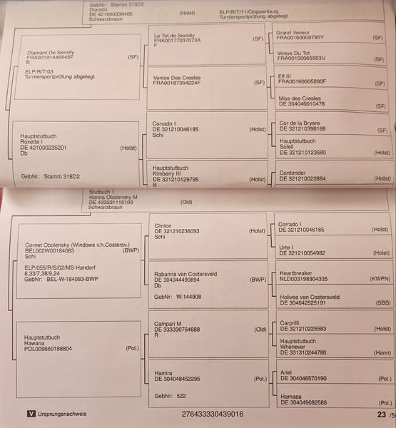 Deja Vu M (Diarado x Cornet Obolensky): kary, dziesięcioletni wałach oldenburski – bezpośrednio od hodowcy. Ojcem Deja Vu jest Diarado (Diamant de Semilly x Corrado I). To obecnie jeden z najwybitniejszych reproduktorów koni sportowych na świecie, który od lat utrzymuje się w ścisłej czołówce rankingów Światowej Federacji Hodowli Koni Sportowych, szczególnie w dyscyplinie WKKW. Po nim właśnie Deja Vu odziedziczył potęgę skoku, nieustraszoność, koncentrację na przeszkodzie, jak również świadomość swoich możliwości fizycznych. Jego matka (Cornet Obolensky x Campari M) oraz babka pochodzi z naszej hodowli. Obie pokryte były topowymi ogierami. Wszak nikomu w świecie końskim nie trzeba przedstawiać legendarnego Corneta Obolensky! Lata mijają, ale Cornet pozostaje jednym z najważniejszych założycieli linii koni skokowych. Deja Vu ma w sobie duszę zawodnika kochającego ruch, wysiłek i wyzwania. Jest koniem dysponującym dużą siłą, objawiającą się szczególnie w łatwości pokonywania przeszkód, jak i w wytrzymałości podczas pracy. Jego budowa jest dobrze związana, dysponuje rozwiniętym umięśnieniem, co w połączeniu z jego wysokością 173 cm sprawia, że jest urodzonym materiałem na sportowca. Swoje umiejętności rozwija obecnie pod czujnym okiem rodziny Grzegorza Kubiaka (polskiego olimpijczyka i wielokrotnego medalisty mistrzostw Polski). Dodatkowo by uwszechstronnić jego zdolności, a jednocześnie wyczulić na posłuszeństwo odbywał także treningi, zarówno pod ujeżdżeniową zawodniczką na poziomie Grand Prix Teresą Tomaszewską, jak i u Pawła Spisaka, czyli jednego z z najbardziej utytułowanych polskich jeźdźców specjalizujących się głównie we WKKW. Z jego potrzeby ruchu wynika to, że jest przyzwyczajony do codziennego padokowania. Biorąc pod uwagę jego dużą siłę i mocny charakter uważamy, że najlepiej jego potencjał rozwinie osoba doświadczona i pewna siebie na tyle, aby potrafiła wyznaczać mu jasne ramy i zasady współpracy. W stosunku do innych koni może być dominujący, choć do tej pory nie odnotowaliśmy konfliktów pomiędzy końmi koło których przebywa. Wobec człowieka zachowuje zdrowy dystans, wykazuje zaciekawienie i chęć do pracy. Cena: 18 850 EUR / 80 000 PLN, ale jesteśmy oczywiście otwarci na negocjacje. Jeśli byliby Państwo zainteresowani, to jesteśmy przekonani, że się dogadamy. Zapraszam do kontaktu, a udostępnimy więcej filmów. Z radością też umówimy się na jazdę i pokaz na żywo. Tel./Whatsapp: 601 344 489