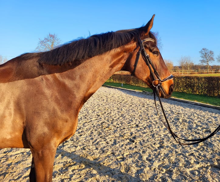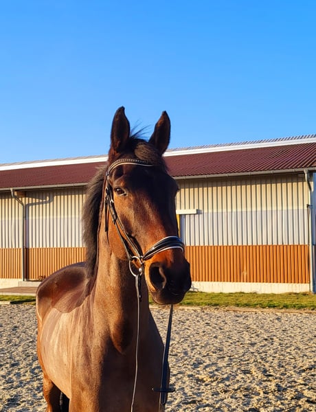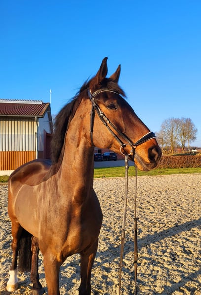Freddy ist ein 2015 geborener dunkelbrauner Wallach von Don Frederic - Siegerhit - Donnerhall und ist ca 176 cm groß. Er ist ein sehr freundliches Pferd mit drei überaus tollen Grundgangarten was einem ein wirklich schönes Reitgefühl vermittelt. Er lässt sich gern betüddeln und beschmusen, ist auch sehr verträglich mit anderen Pferden und genießt den täglichen Weidegang. Aufgrund seiner Größe ist er relativ spät entwickelt und hat dafür in jungen Jahren die nötige Zeit in der Ausbildung bekommen. Er ist bei uns geboren und ausgebildet, nun suchen wir ein schönes neues 4* zu Hause für ihn mit tollen Haltungsbedingungen. Wir sehen ihn nicht als Anfängerpferd.