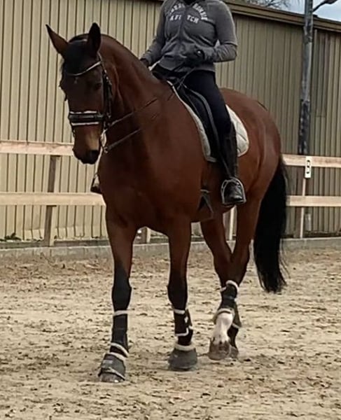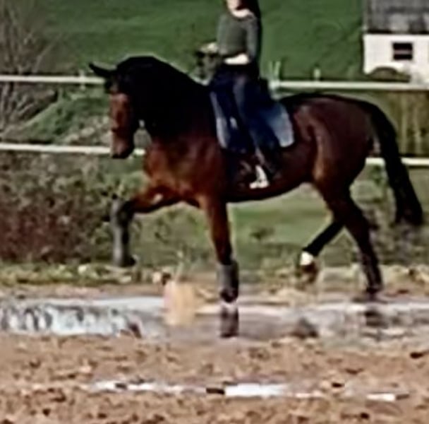An impressive Oldenburg gelding is for sale. This handsome bay impresses with a height of 178 cm and is a real eye-catcher. He is always decent when ridden, can be relied upon to go out alone or in a group, and also enjoys jumping a small course (also with a dressage rider). His dressage training level is M-ready (unfortunately the videos are a little older). With his excellent training and elegant appearance, he is the ideal partner for any ambitious rider. Due to his pedigree-appropriate - always adjustable - go, he is also ideal for an eventing rider. He is well-behaved and knows his way around a horse walker, paddock and paddock. If you are looking for a talented and experienced riding horse that is convincing both in the arena and in everyday handling, then he could be just the right horse for you. Here is a youtube link: https://www.youtube.com/watch?v=mZDy4KLL4hg For further information and to arrange a viewing appointment, please contact us.