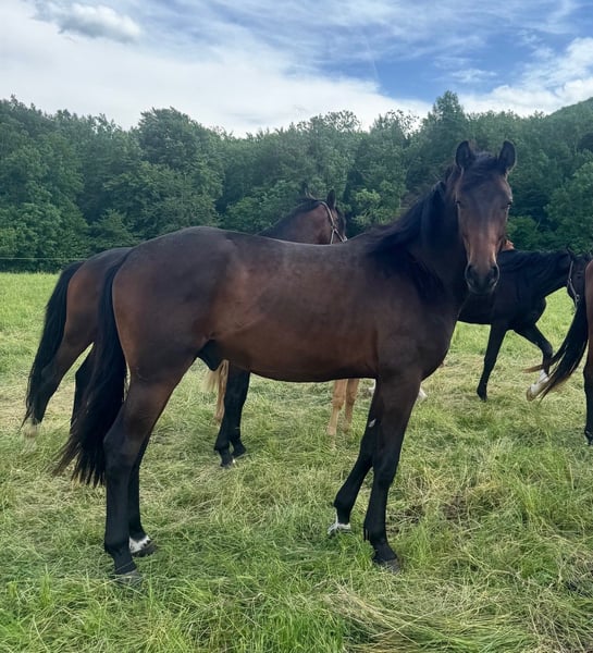 Étalon de dressage brun foncé – 3 ans – Élevé en propre À vendre, un impressionnant étalon de 3 ans, d’un élégant brun foncé, issu de notre propre élevage. Ce jeune espoir sportif allie génétique moderne en dressage, charisme, qualité et potentiel pour l’avenir. Issue de la souche de Morricone et Quaterman, réputés pour leur aptitude au dressage, il possède une excellente predisposition pour le haut niveau en dressage. Sa lignée maternelle est également marquée par le célèbre reproducteur Rohdiamant, ce qui rend cette lignée particulièrement intéressante. Ce sang de grande qualité garantit une origine de dressage de premier ordre, qui fait battre le cœur des éleveurs tout comme celui des cavaliers ambitieux, en leur offrant les meilleures perspectives sportives. Ce mâle se distingue par : • Un extérieur harmonieux et moderne • Un bon fondement et de bons pieds • Trois allures très bonnes avec une balance naturelle • Un tempérament intelligent et proche de l’homme • De solides bases pour une future formation en dressage • Un potentiel sportif et de reproduction intéressant grâce à une génétique précieuse et auto-produite Élevé en propre, il a été soigneusement préparé dès le début et connaît bien le contact avec l’humain. Il est confiant et sans peur. Un talent de dressage avec une origine convaincante et une perspective sportive claire – idéal pour tous ceux qui recherchent un jeune étalon de qualité, à former eux-mêmes ou à intégrer dans un projet de reproduction précieux.