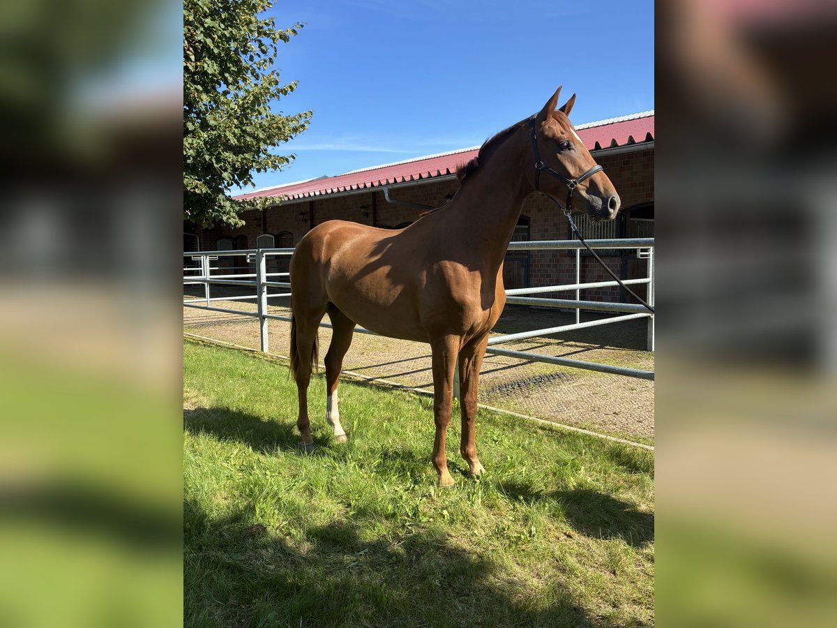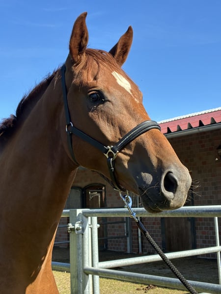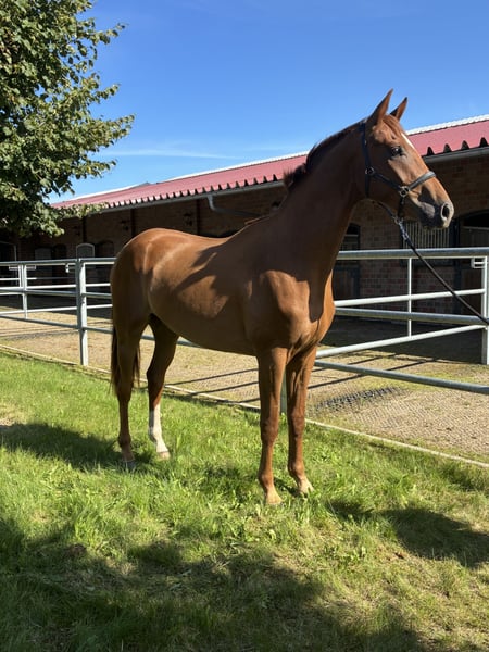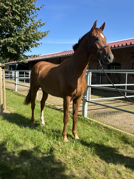 Dinzler… 2-letni, dużej budowy, kasztanowaty wałach, dobrze wykształcony pod względem podstawowym, z 3 bardzo dobrymi GGA. Jako źrebię otrzymał prestiżową ocenę i pochodzi z bezpośredniego linii matki Don Schufro. Matka Florelia uzyskała wysoką ocenę SLP i brała udział w elitarnej wystawie klaczy w Rastede. Jej półbratem jest westfalski prymowany ogier Fürst Romanov, który obecnie startuje w Grand Prix w USA. Przodkinią była Florell, która była klaczą w Brilliantring w Rastede. Przodek ze strony matki, Fiesta’s Girl, jest pełną siostrą Don Schufro i wydała na świat kilka ogierów z licencją. Dinzler dorastał w naszej małej grupie hodowlanej, był regularnie czesany przez kowala, odrobaczany i szczepiony. Jest bardzo posłuszny i ma przyjazny charakter. Może jeszcze pozostać w grupie hodowlanej aż do momentu wejścia do stajni. Brak badania TÜV. Zapraszamy do kontaktu. Telefon: 0174-9049299