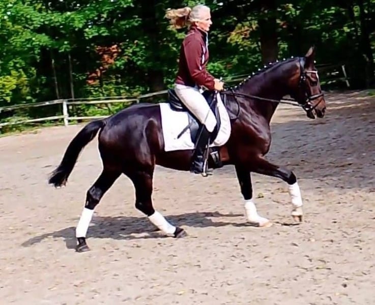 Der Wallach ist ein unkomplizierter und besonders liebenswerter 3j., der eine hohe Grundqualität in allen drei GGA besitzt. Besonders hervorzuheben ist sein schwungvoller, lockerer und taktreiner Trab. Dieser und seine hervorragende Rittigkeit qualifizieren ihn für eine erfolgreiche Karriere im höheren Dressursport. Für ihre qualitativ hochwertigen Nachkommen erhielt seine Großmutter den Titel: "Elitestute". U.a. ist ein Bruder von dem Wallach Mutter bis Inter II erfolgreich. Seine Bereiterin ist besonders beeindruckt von seinem sehr guten Charakter. Erst seit Juni in Beritt, zeigt sich der Wallach stets arbeitsfreudig, unkompliziert und zuverlässig, was besonders dadurch deutlich wird, dass sie ihn im Gelände reitet. Im Umgang ist er ein Schatz und er stand bisher mit Wallachen und auch Stuten zusammen, wobei er sich sehr sozial zeigt. Auch beim Freispringen ist er geschickt und motiviert. Der Wallach ist ein Pferd, welches keine Wünsche offen lässt, sogar ein Röntgen TÜV o.b.B. incl. Hals und Rücken liegt vor. Wir erheben KEINE Gebühren fürs Probereiten sondern freuen uns über Ihren Besuch.