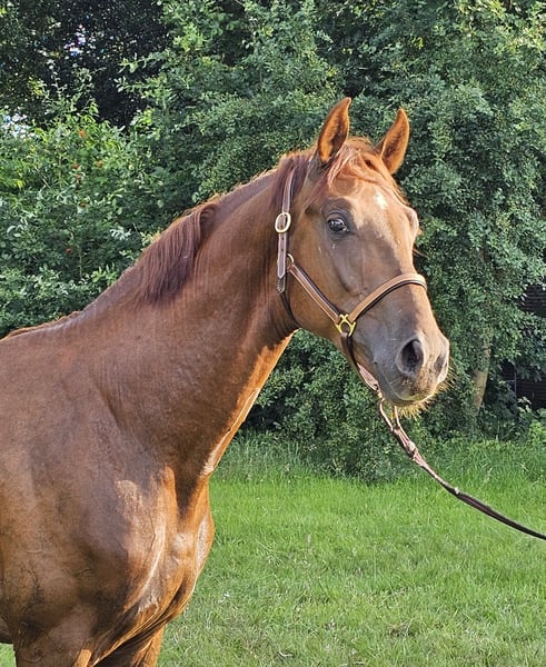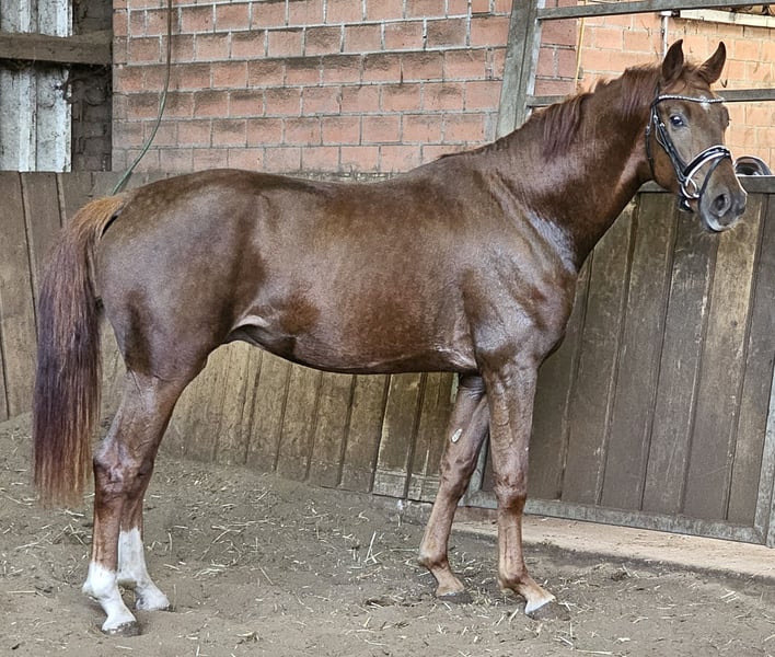 This elegant dark chestnut not only impresses with his attractive appearance, but also with his loving, hard-working nature, his three very good gaits and his enormous charm. He has a lot of courage to explore everything and always shows his good working attitude, even at the first small jumps. He stands together with two buddies and shows hardly any/no stallion manners. He can be haltered and led away from them without any problems, for example into the riding arena on his own. No sticking. He can be neutered on the spot if required. Other siblings/mother can be viewed at the farm. Please contact us for further information and to arrange a viewing. 01736334318 or 059391321