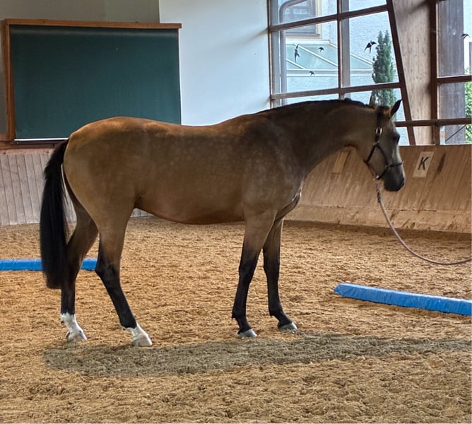 Hijo de Qandide, de 2,5 años, de una madre con altas calificaciones, descendiente de Rock Forever x Florestan x Donnerhall, que fue campeona en DPM y es una yegua DSP premiada en deporte. Criado con mucho cuidado, con una excelente mineralización y cuidado, Prinz presenta tres movimientos básicos muy correctos, es muy dócil en su manejo, en el herrador y con el veterinario. Está acostumbrado a ser llevado, en box individual durante el día y pastando por la noche. Deseamos para él un nuevo dueño que le brinde alegría y bienestar. Contacto: Andrea Pollich, Teléfono: 0049-1755252297, correo electrónico: ostpol@t-online.de