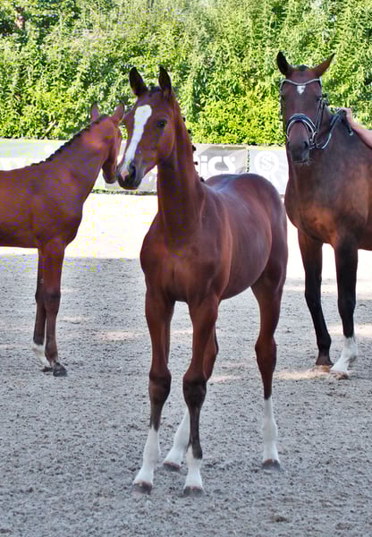 Beautiful colorful stallion candidate from proven mating. Mother herself was successful in amateur sports until S*. Descended from our körsieger "Cafe au lait", which has been attracting attention for some time with its incredibly successful breeding in dressage and show jumping (can also be visited on site). One of the few sires who can boast several successful offspring in both disciplines up to the heavy class! So Cafe's Casimir" (Cafe au lait x Calido x Grannus) was celebrated prize top of the Oldenburg elite auction, has already been series winner in dressage horses L and M at a young age, 7 years old in his first S-dressage again series winner and meanwhile won the first S**! Stute Kasselmanns Cafe's Caletta (Cafe au lait x Calato) is already placed S-Dressage and international Grand Prix victorious. Cafe's Matts became the second most expensive dressage horse of the Oldenburg Summer Mixed Sales. Other young horses from jumping mother mares have already been placed several times in dressage horse tests A and L and are remarkably strong in movement and head-clear. There is no question that the Cafe au lait convince offspring in show jumping up to the heavy class. So the licensed Cafe's Champus under Rene Tebbel became vice world champion of the young horses and is also in deck use with us. Also licensed and from our breeding: Cafe Junior (Cafe au lait x Silvio I), international S* jumping placed. Cafe au lait itself was under Philipp Weishaupt Bundeschampionatsfinalist and has been successful up to S*** jumping, but has also been equipped with three spectacular GGA and trained dressage at S level. Stationed at Paul Schockemöhle, he has already produced several internationally successful show jumping horses, including "Royce", victorious in the FEI CSI5* $500,000 Rolex Grand Prix Wellington. Our foals get daily mineral food and foal starters, regularly EQUISTRO Haemolytan and Ipaligo Foal, worm cures and blacksmith are of course also a matter of course. The mothers also receive special mare food, juice food, linseed oil and hay ad libitum throughout the pregnancy. So our broodmares and their offspring are always in the best state of health! Request videos via WhatsApp under 015111527971. Visits possible daily. More young horses on request, a part can be found under the other advertisements. Trade-in of suitable breeding mare possible.