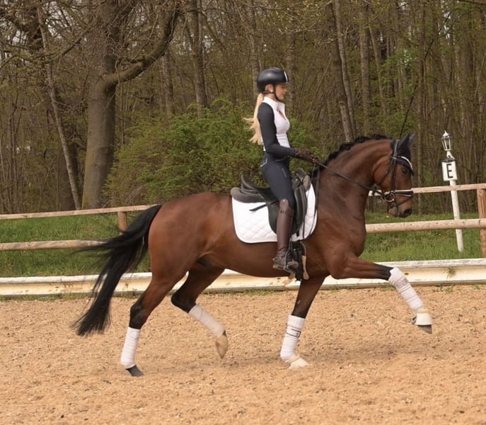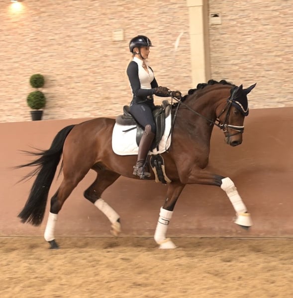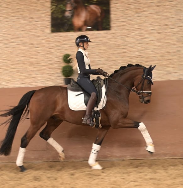 Liebe Interessenten, Für Terminvereinbarungen Probereiten senden Sie mir bitte eine WhatsApp. Für weitere Fragen bin ich tagsüber per WhatsApp erreichbar, telefonisch erreichen Sie mich am Besten zwischen 16 und 19 Uhr. Ich freue mich auf eine Kontaktaufnahme www.angelina-devittorio.de ⭐️Fynch Cookie⭐️ • Alter: 5 Jahre (2021) • Größe: 1,63 m Abstammung: Fynch Hatton x Bordeaux Ausbildungsstand: DressurpferdeA-Niveau, L Lektionen begonnen • AKU: gute Röntgenbilder vorhanden Zum Verkauf steht ein herausragender fünfjähriger Sohn des Fynch Hatton, der mit drei exzellenten Grundgangarten und Championats-Qualität überzeugt. BreeFood’s Fynch Cookie begeistert insbesondere durch seine beeindruckende Trabmechanik mit aktivem, kraftvoll untertretendem Hinterbein. Seine bergauf angelegte, ausdrucksstarke Galoppade zeigt bereits jetzt beste Ansätze zur Versammlung. Auch sein Schritt ist von überdurchschnittlicher Qualität und lässt keine Wünsche offen. Neben seinen sportlichen Qualitäten punktet er mit einem hervorragenden Charakter: stets freundlich, menschenbezogen und mit viel Freude bei der Arbeit. Er ist angenehm zu reiten und macht sowohl im täglichen Umgang als auch in der Ausbildung große Freude. Direkt vom Züchter stammend, wurde Fynch Cookie schonend und pferdegerecht ausgebildet und auf seine weitere sportliche Laufbahn vorbereitet. Er stammt aus einem hochinteressanten Sporterfolgreichen Mutter Stamm. Wer für die kommende Saison ein vielversprechendes Nachwuchspferd mit Championats-Potenzial sucht, wird hier fündig. Ein absolutes Traumpferd, das bereit ist, direkt loszulegen und Erfolge zu sammeln. ⚜️Tel: 0171-3438949 ⚜️a.devittorio@web.de ⚜️www.angelina-devittorio.de / https://www.ehorses.de/angelinadevittorio Facebook und Instagram Angelina De Vittorio Videos bitte per WhatsApp 00491713438949
