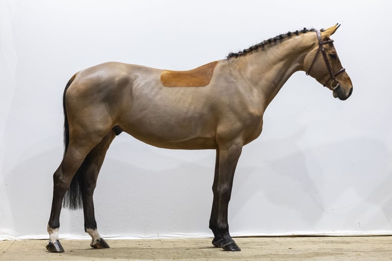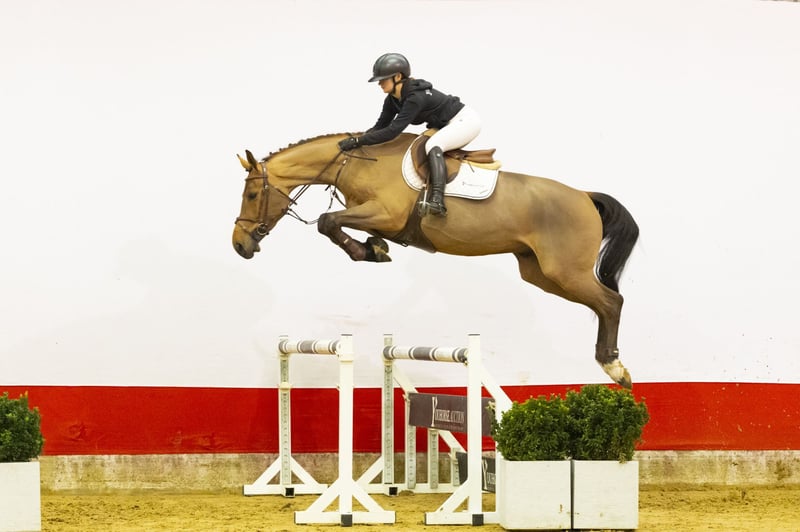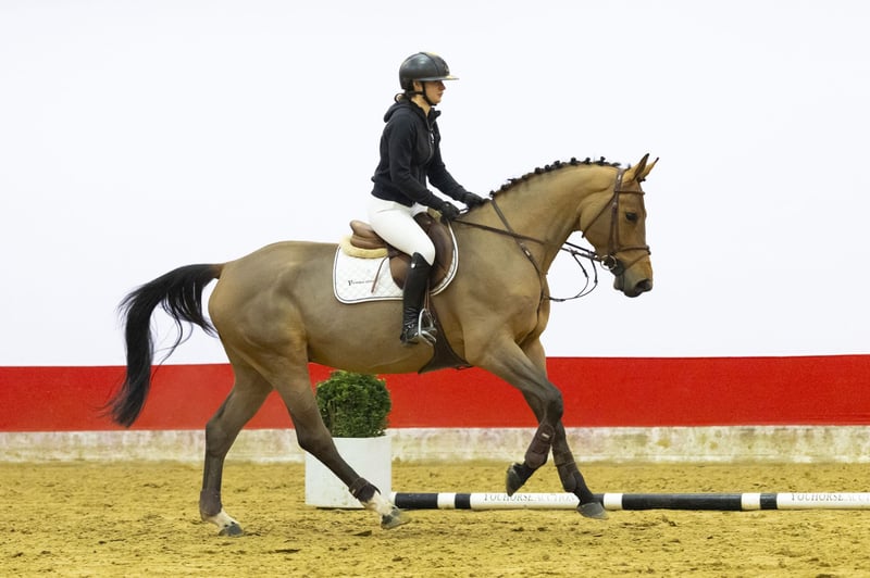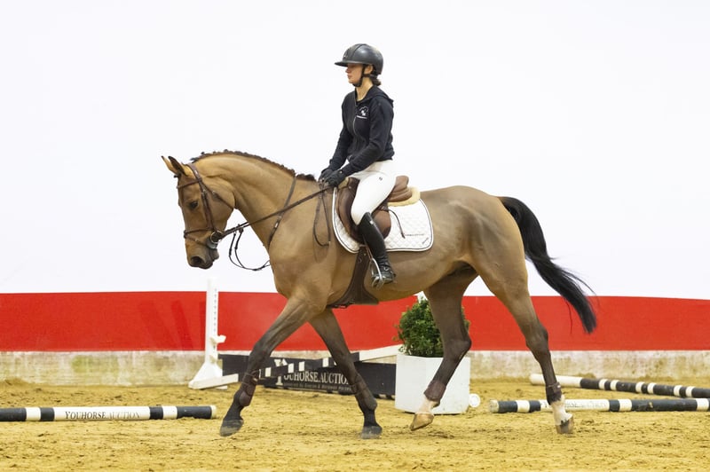 A light-footed horse with plenty of scope and experience at 1.20m level. She is pleasant to ride and combines quality with a good attitude. She has a big canter, is quick off the ground and jumps with conviction. Beautifully long-legged and modern in type. A horse with the right blood for sport and the mindset to develop further.