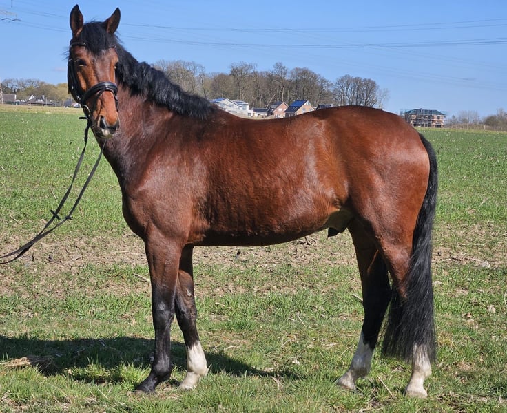 Dieser vielversprechender Allrounder, geboren im Jahr 2020 mit einem derzeitigen Stockmaß von ca. 1,65m sucht im Auftrag der Züchterin wegen Zuchtaufgabe ein neues Zuhause. "Paddy" zeigt sich bei der täglichen Arbeit immer motiviert und lernwillig, egal, ob bei der dressurmäßigen Arbeit, im Gelände, an der Longe oder über kleine Sprünge. 4jährig angeritten wird er zur Zeit seinem Alter entsprechend vielseitig ausgebildet. Er ist dressurmäßig auf A-Niveau, L-Lektionen werden nun langsam erlernt, er geht artig und unerschrocken ins Gelände und hat auch kleine Sprünge unter dem Reiter bereits gemeistert. In Letzterem wurde er bisher nicht weiter gefördert, zeigt hier aber auch Potential und die richtige Einstellung zum Sprung. "Paddy" ist im Umgang, beim Schmied und beim Verladen artig und ist regelmäßig entwurmt und geimpft. Hunde, Trecker, Kinder, etc. sind ihm vertraut. Aktuell ist er barhuf, steht nachts in der Box und tagsüber draußen in der Gruppe, kennt aber auch 24/7 Weide und sowohl Wallach-, als auch gemischte Gruppen. Für weitere Informationen und einen Besichtigungstermin nehmen Sie gerne Kontakt auf. Ein Probereiten ist nach Absprache möglich.