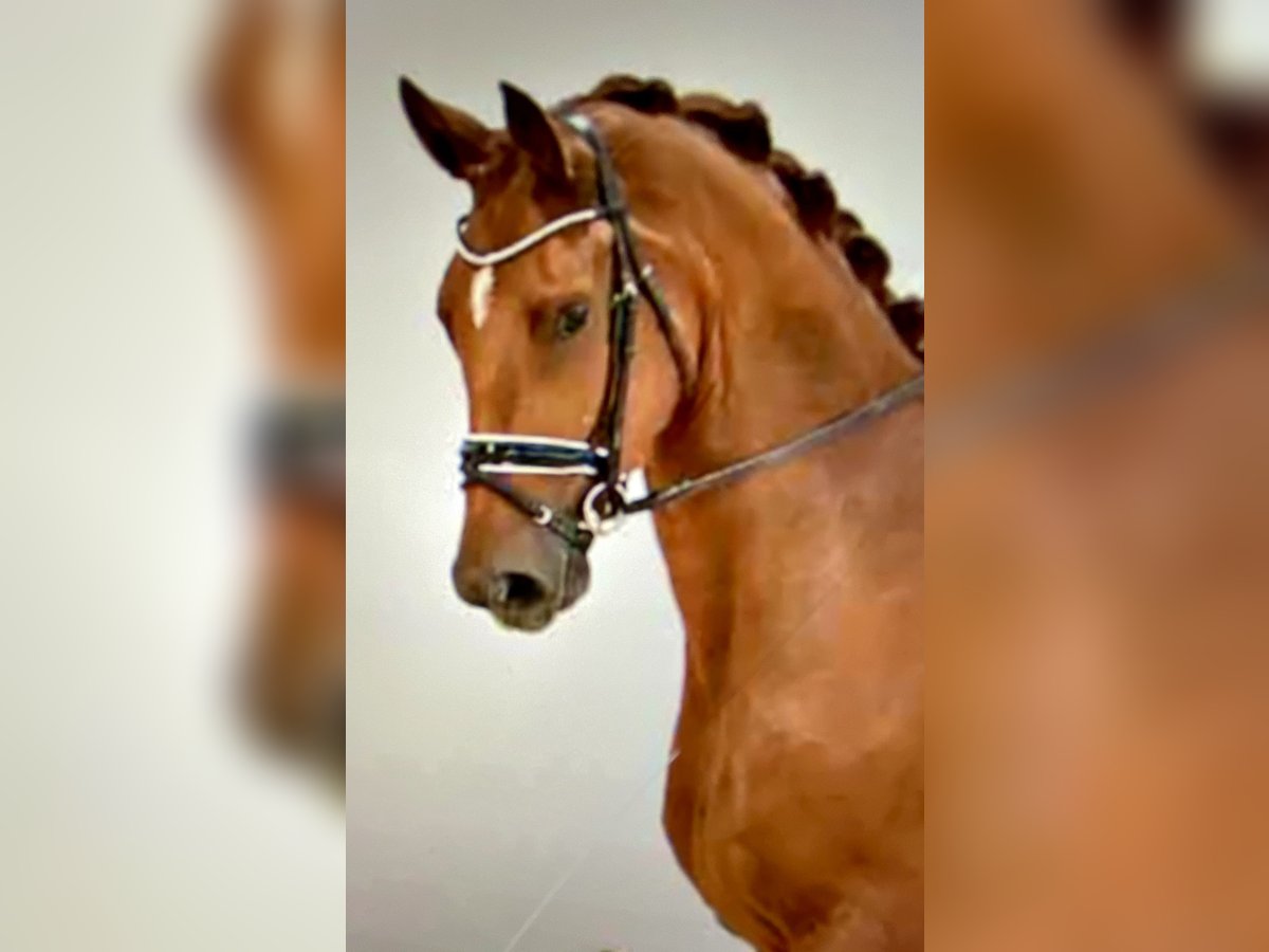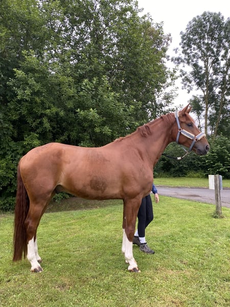 **Sale ad: Elegant Oldenburg gelding** An impressive Oldenburg gelding, born in 2020, is for sale. This charming chestnut not only impresses with his eye-catching appearance, but also with his outstanding potential in dressage sport. He was given plenty of time to grow. He was gently broken in at the age of four and has been professionally encouraged and trained ever since. He has four evenly high boots and a beautiful forehead mark. His dam is a sister to a two-time Olympian and from a proven Grand Prix line. He comes directly from a breeder and his siblings are also being promoted in the renowned stables. **Characteristics:** - Breed:** Oldenburg - Sex:** gelding - Year of birth:** 2020 - **Color:** chestnut - Height:** 178 cm - **Discipline:** Dressage This gelding is characterized by his elegant movement and friendly nature. He is ready to shine in dressage with his future owner and to be further developed. His potential and willingness to learn make him an ideal partner for ambitious riders. If you are interested, we look forward to hearing from you to share more information and arrange a viewing.