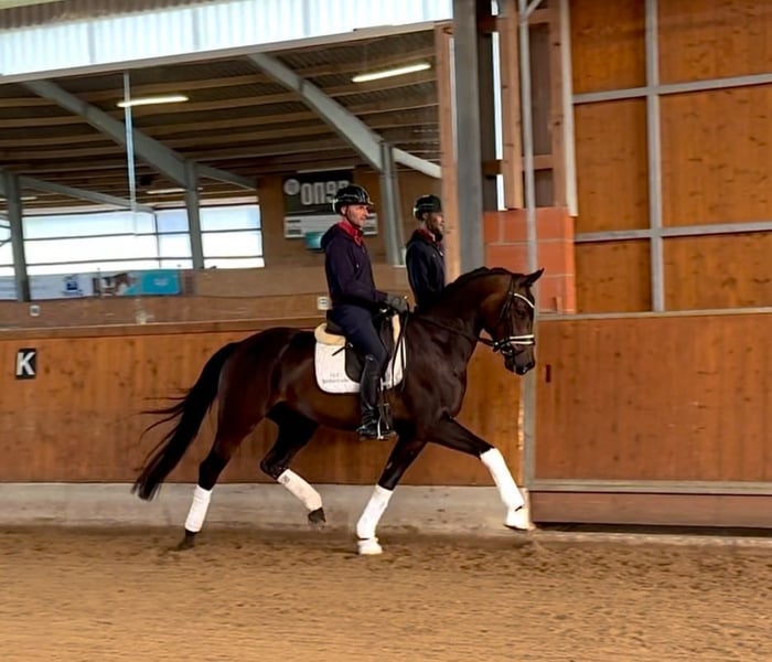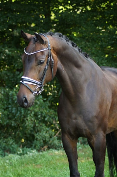 Ferdinand es un semental de 6 años de For Romance x Dimaggio. Ya ha tenido éxito en competiciones de caballos de doma en las categorías A y L. No solo impresiona por su excepcional potencial de movimiento, sino también por su alta disposición al trabajo y su carácter agradable en el trato diario. Destaca especialmente su muy buen trote con mucha expresión. Todos los aires poseen un balanceo natural, una parte trasera activa y un amplio alcance. Ferdinand tiene mucho talento para la recogida y los primeros pasos de piaffe, lo que lo convierte en un candidato ideal para una formación adicional en la categoría alta. Trabaja motivado, tiene un carácter equilibrado, es fácil de montar y siempre se esfuerza por agradar a su jinete. Un caballo joven ideal para jinetes ambiciosos que buscan un compañero con perspectivas.