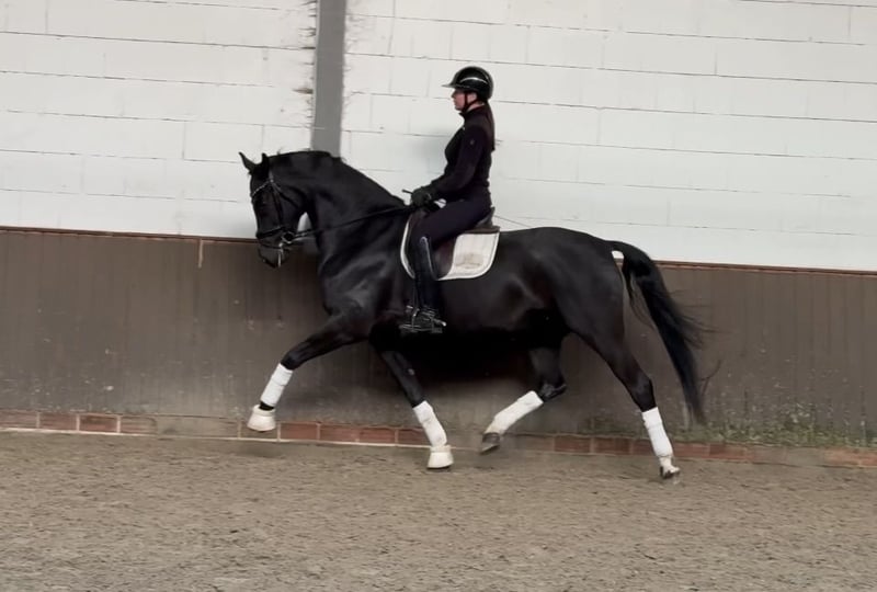 Liebe Kaufinteressenten, Für Fragen oder Terminvereinbarungen senden Sie uns bitte eine WhatsApp oder E-Mail. Telefonisch erreichen Sie uns WERKTAGS und am besten gegen Mittag. Sollte dem nicht so sein, bitte einfach eine Nachricht schreiben und wir melden uns zurück. Wir freuen uns auf Ihre Kontaktaufnahme! „Davi“ ist ein bildhübscher schwarzer Schönling, der durch sein auffälliges, im Hengsttyp stehendes Erscheinungsbild und seine überragende Qualität direkt alle Blicke auf sich zieht. Er weiß durch seine überdurchschnittlichen Grundgangarten und seine wahnsinnig tolle und positive Arbeitseinstellung sehr zu überzeugen und ist ein ganz wunderbarer Tanzpartner für die gehobenen Ansprüche. In Holland hat er bereits bei seinem ersten Turnierstart Z1 (M-Niveau) gewonnen. Durch seine unkomplizierte Art und seinen liebevollen Charakter ist er ein wirklich toller Freund und Sportpartner. Er macht schon tolle Traversalen im Galopp, schöne fliegende Wechsel und auch die Galopp Pirouetten fallen ihm leicht. Halbe Tritte bietet er ebenfalls spielerisch an. Wer nach einem sehr chicken, treuen und leicht zu reitenden Hinkgucker für die Zukunft sucht, ist bei ihm genau richtig. Direkt vom Züchter. Guter TÜV vorhanden.