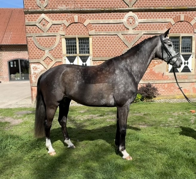 Mit Enno bieten wir einen rittigen und bewegungsstarken 7-jährigen Wallach für den gehobenen Dressursport an. Als Fohlen vom Züchter erworben, wurde er altersgerecht ausgebildet. Enno ist Halbbruder zum renommierten Vererber Floricello (Wadenspanner). Er ist siegreich in der Klasse A** sowie platziert in Dressurpferdeprüfungen der Klasse A und L. Er zeigt besonderes Talent für die Seitengänge und die Verstärkungen. Nach einer wetterbedingten Winterpause befindet er sich nun wieder im regelmäßigen Training und lernt derzeit die fliegenden Wechsel. Enno zeigt sich lernwillig und bringt Potential für das große Viereck mit. Außerdem geht er gerne ins Gelände und wurde im Springen bis zur Kl. A gefördert. Da ich ihm aus beruflichen Gründen zeitlich nicht gerecht werde, suchen wir für ihn einen routinierten und ambitionierten Reiter, der diesen Rohdiamanten weiter fördert. Ein moderner Sportler für das große Viereck, der bereit ist für den nächsten Karriereschritt. Dreijährig wurde ein einwandfreier Züchtertüv angefertigt, darüber hinaus gibt es bislang keinen Tüv. Enno war noch nie lahm. Um Reittourismus zu vermeiden, erheben wir für Probereiten eine Gebühr von 25€, die beim Kauf verrechnet wird.