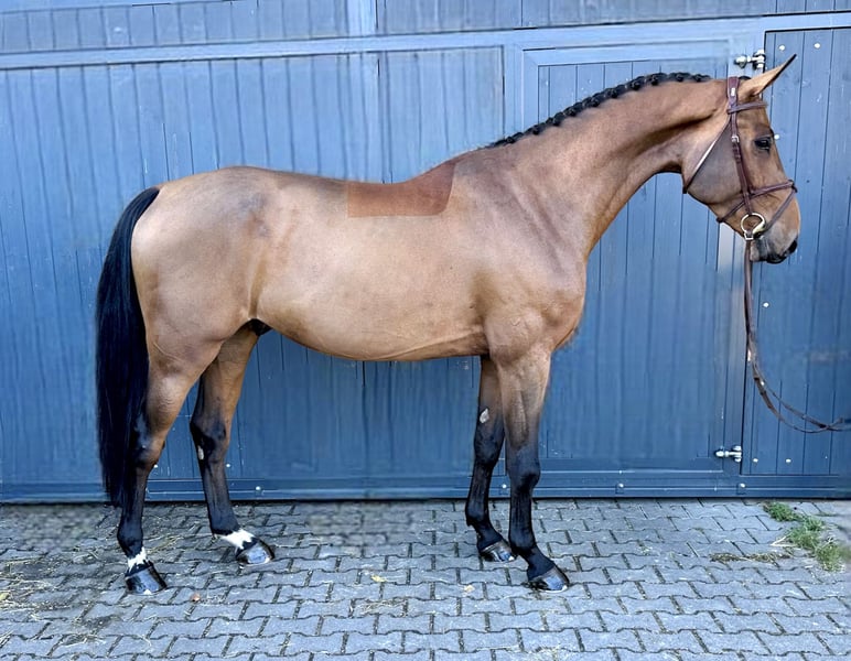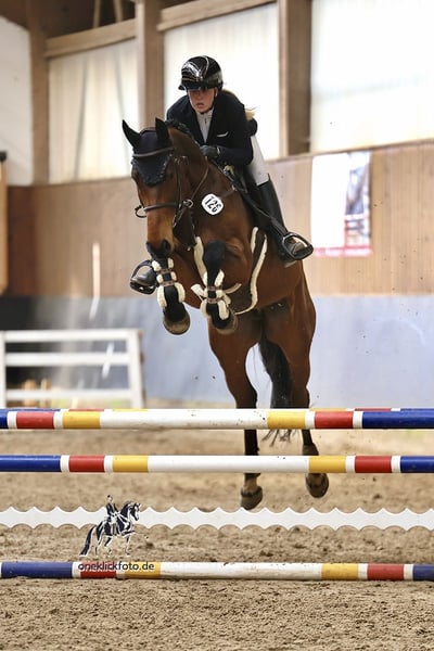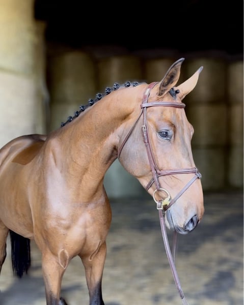 Hello, my name is Ms Derik, but everyone just calls me Fred. I was born in Mecklenburg in 2019 and branded as an Oldenburg sport horse. As a gelding with excellent athletic potential, I am now looking for a person who will continue to nurture me and wants to go through life with me. My sire is none other than Diamant de Semilly, an internationally successful show jumping sire, and my dam is by Cassini II. She was successful up to 1.20 m with my owner and introduced her to the sport as a junior – I guess I inherited quite a bit of talent! Since the beginning of 2023, I have been gently trained under saddle in both jumping and dressage and am continuously developing. In 2024, I competed in my first show jumping competitions and was immediately placed in a show jumping horse A* class. In 2025, I have already participated in a tournament (show jumping horse A* & A**) and achieved a solid score of 7 twice. In dressage, I am currently at A/L level and am learning with great motivation. Due to my height of 1.75 cm, collected exercises are still a bit challenging for me, but I always do my best and try to do everything right. Besides work, I love going for rides in the countryside, both alone and in a group with friends. I am very well-behaved and open-minded in handling and enjoy being pampered off the arena as well. Farrier, physiotherapist, and veterinarian are my friends whom I am always happy to see. I know the basics of groundwork and also enjoy working on the lunge. Since we regularly travel to off-site training and competitions, I am used to trailer rides. Normally, I load calmly, but if I haven't fully woken up, I sometimes need a bit of encouragement or a carrot. Currently, I am in a herd during the day with my buddies and spend the whole day outside, which does me a lot of good. At night, I relax in my home, aka the box. At the moment, I am shod in front, which gives me even more comfort on various surfaces, but my hooves are actually in very good condition. A vet check from 2023 is also available, but the vet didn't find anything unusual. If you would like to see me in action, my owner can gladly send you a video and, of course, provide further information. I look forward to meeting you! ✨