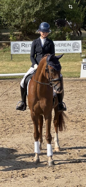 Darcey is a very well-trained and talented dressage horse who is very easy to ride. He has already won at L-Dressage level and achieved impressive results during his first competition season with his young rider. He also shows great enthusiasm and talent in jumping. He doesn’t look at jumps, approaches them well, and confidently navigates a course. In the cross-country and on the outdoor arena, he is well-behaved, reliable, and easy to handle at all times. In terms of temperament, he is very people-oriented, friendly, and straightforward. He gets along perfectly with other geldings in his group and also coexists well with mares. Darcey was licensed as an Oldenburg but was later castrated as a sport horse. Due to a minor issue that does not affect his suitability as a sport horse, he is being offered at a below-market price. We are looking for someone who can give Darcey variety and continue to develop his potential. He has a wonderful character, is farrier- and loading-friendly, and is regularly vaccinated, dewormed, and recently had a dental check. X-rays, including of the neck and poll, are available without any findings. If you are interested, please feel free to contact us at 0172-54 86 008. Videos and further information are available via WhatsApp.