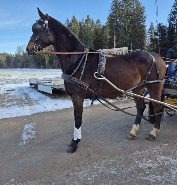 Due to a change in driving sports, this 2018-born gelding by Shamrock x Rotspon is for sale. Salvador has been primarily trained in combined driving, where he has reached up to class M in single harness and can also be driven easily in pairs. He is very motivated when in front of the carriage and is easy to handle with minimal aids. Under saddle, Salvador is less experienced and still somewhat unsure, but always well-behaved and eager to learn. Thanks to his three excellent gaits, with further training he will undoubtedly be a real eye-catcher in the dressage arena as well. Being very willing to learn, his continued education will surely be a pleasure. Salvador would also thrive as a vaulting horse. His large, smooth uphill canter has already been tested for this purpose, and he proved to be calm and brave right from the start. This handsome gelding is looking for a loving home where he will be properly supported and trained. Good x-rays and a back report are available. He is farrier- and loading-friendly. No vices. The gelding has a voice that in no way restricts him. Further videos are available upon request! Serious inquiries are welcome to arrange a trial ride, drive, or vaulting session.