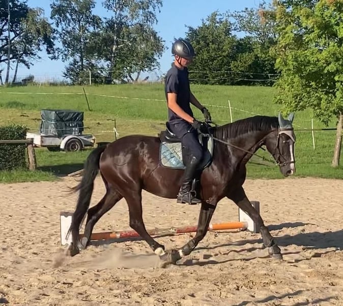Oldenburgischer Wallach, 8 Jahre alt, 1,70 m, Rappe Eleganter Wallach als Dressurpferd oder gehobenes Freizeitpferd V.: Bordeaux, MV.: Dankeschön Aus gesundheitlichen Gründen suche ich für Bobby ein liebevolles neues Zuhause. Er ist seit zwei Jahren in meinem Besitz und befindet sich auf solidem A-Niveau, mit Potenzial für höhere Klassen. Er ist ein liebevolles Pferd mit viel Ausdruck und möchte im täglichen Umgang sowie beim Reiten konsequent gearbeitet werden. Auf dieser Basis vermittelt er dem Reiter ein gutes Gefühl und zeigt sein volles Potenzial im täglichen Training. Bobby besitzt drei gute Grundgangarten und wurde bei uns behutsam in allen Disziplinen weiter ausgebildet. Er liebt Abwechslung, geht auch alleine ins Gelände und zeigt sich in der Bodenarbeit sehr feinfühlig. Wer diesen tollen Allrounder weiter fördern möchte, hat einen großartigen Partner an seiner Seite. Bobby ist geimpft und entwurmt. Er wurde regelmäßig osteopathisch behandelt und einmal jährlich dem Zahnarzt vorgestellt. Er ist vorn und hinten beschlagen. Nach einer verletzungsbedingten Pause wird er derzeit wieder fit gemacht. Das Probereiten wäre frühestens Anfang des Jahres möglich, die Besichtigung kann gern jederzeit erfolgen. Fragen zum Pferd beantwortet die Trainerin gern unter 0162/2738110. Videos auf Anfrage.