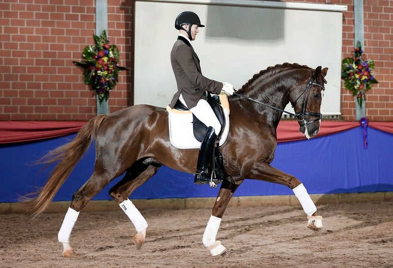 Don Deluxe ha iniziato la sua straordinaria carriera con una vittoria al Körung di Oldenburg nel 2013, dopodiché è stato acquistato all'asta da Andreas Helgstrand per la cifra di 910.000 euro (!) ed è stato inserito nel roster dei riproduttori della stazione danese Helgstrand Dressage, con cui ha vinto il test di stalloni DWB di 35 giorni nel 2015. La sua carriera sportiva è stata interrotta da un grave infortunio, ma è rimasto attivo e molto richiesto come stallone da riproduzione, lasciando numerosi discendenti, principalmente in Danimarca e Germania, e influenzando significativamente l’allevamento di cavalli dressage in Polonia negli ultimi anni. Don Deluxe è figlio del leggendario De Niro, stallone che da anni domina la classifica WBFSH, lasciando un’eredità di oltre 70 stalloni riconosciuti e un numero incalcolabile di cavalli di alto livello nel mondo sportivo, tra cui ben 7 che hanno partecipato alle Olimpiadi di Londra. La madre di Don Deluxe è una figlia del tre volte vincitore dei Campionati di Oldenburg, lo stallone Rosario, a sua volta figlio del famoso Rubinstein, uno dei più importanti riproduttori nell’allevamento di cavalli da dressage. Sua figlia, Rosaria Deluxe EM (s.o. Fürst Romancier), è diventata Supercampionessa del Campionato Open di Puledri di Razza Nobile, dove ha ottenuto punteggi di 10 per il tipo e 9 per il movimento, dominando il più grande gruppo di 33 puledri con pedigree dressage nelle esposizioni polacche e successivamente è stata venduta all’asta Cichoń Foals Auction per 12.000 euro. Questa vendita ha rappresentato un’altra ottima vendita di un puledro di Don Deluxe – nel 2021, una delle più alte quotazioni all’asta (13.500 euro) è stata raggiunta dalla puledra Dauphine Varmeto. Qualche settimana più tardi, Si Donna Deluxe (s.o. Insider), montata da Karola Mazurek, ha conquistato la medaglia d’oro ai Campionati Polacchi di Cavalli Giovani di 4 anni, ottenendo un punteggio finale dell’81,2%, con 8,4 punti per il passo, 8 punti per il trotto e 8,2 punti per l’obbedienza e il potenziale. È quindi il secondo anno consecutivo che i discendenti di Don Deluxe salgono sul podio dei MPMK – nel 2022, il bronzo è stato assegnato al stallone All Deluxe (s.o. Romantiker), montato da Anna Skrzeszewska-Walter. Negli Stati Uniti, Don Perignon (s.o. Kansas C) ha ottenuto successi a livello di piccola circuitazione, mentre in Germania sono stati registrati finora 64 cavalli sportivi e 28 puledre da riproduzione, di cui due hanno ricevuto il premio statale. Don Deluxe ha anche cinque figli riconosciuti come stalloni di alta qualità!