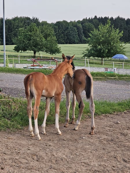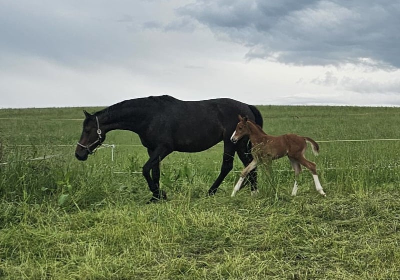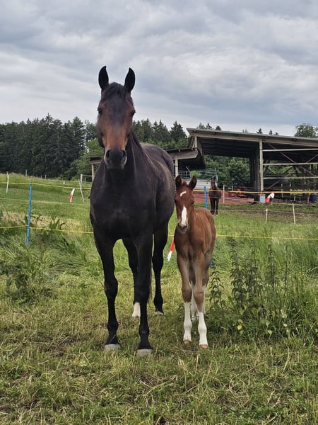 Due to breeding retirement and an upcoming stay abroad, this handsome and well-behaved colt by BENICIO is available for sale. He has excellent movement, is long-legged yet bone-strong, elegant, correct, and full of charm. He is very trusting and will grow to a large size. His dam is 176 cm (about 16.1 hh), and he is a full brother to a 2023 foal already reaching 170 cm (around 16.3 hh). The dam is also for sale, either separately or together. Born in May 2025, dark chestnut, Oldenburg line 74.