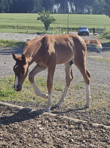 Wegen Zuchtaufgabe und Auslandsaufenthalt ist dieses bildschöne, brave Hengstfohlen v. BENICIO abzugeben sehr gute Gänge, langbeinig und doch knochenstark, elegant, korrekt und mit viel Charme ausgestattet, sehr zutraulich, wird groß, Mutter 176 cm Stm, Vollbruder von 23 bereits 170 cm Stm. Mutter ist auch zu verkaufen, zusammen oder getrennt geb. 5/2025, Dunkelfuchs Oldenburger Stamm 74