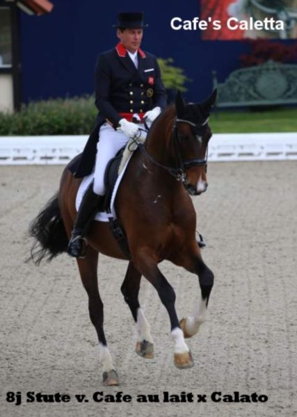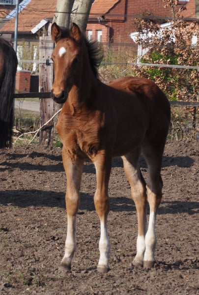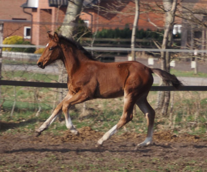 Auch diesem typvollen bunten Absetzer sind Doppelveranlagung und Rittigkeit in die Wiege gelegt worden. Der Vater Cafe au lait, Siegerhengst seiner Körung, HLP Sieger und BuCha Finalist, war selbst siegreich in der schweren Klassen und hat sich in den letzten Jahren einen Namen als Doppelvererber mit Spitzennachzucht gemacht. So wurde Cafe's Casimir" (Cafe au lait x Calido x Grannus) gefeierte Preisspitze der Oldenburger Eliteauktion, ist bereits in jungen Jahren Seriensieger in S- Dressuren und international Intermediaire I siegreich. Stute Kasselmanns Cafe's Caletta (Cafe au lait x Calato) ist ebenfalls bereits S-Dressur platziert und international Grand Prix siegreich. Cafe's Matts (Cafe au lait x Don Frederico) wurde zweitteuerstes Dressurpferd der Oldenburger Summer Mixed Sales. Weitere Jungpferde aus springbetonten Mutterstuten sind bereits mehrfach in Dressurpferdeprüfungen A bis M platziert und sind bemerkenswert bewegungsstark und kopfklar. Dass die Cafe au lait Nachkommen im Springsport bis zur schweren Klasse überzeugen steht außer Frage, so zum Beispiel aus unserer Zucht: Cafe's Champus: gekört, Vizeweltmeister der jungen Pferde Cafe Junior: gekört, international erfolgreich in Saudi Arabien Cafe's Columbo: gekört und sporterfolgreich in Frankreich Cafe's Don Rubin: gekört, 4jährig als jüngstes Pferd Bronze beim Dobrocker Deisterchampionat, jetzt 5jährig mehrfach siegreich in Springpferde L, M platziert und qualifiziert zum BuCha. Cafe`s Deconi: gekört, grade 3jährig 50 Tage Leistungsprüfung mit Noten bis 9,0 abgelegt! Stationiert bei Paul Schockemöhle zeugte Cafe au lait schon etliche international erfolgreiche Springpferde, u.a. "Royce", siegreich im FEI CSI5* $500,000 Rolex Grand Prix Wellington. Cafe au lait selbst war unter Philipp Weishaupt Bundeschampionatsfinalist und ist bis S*** Springen erfolgreich gewesen, ist aber auch mit drei überdurchschnittlichen GGA ausgestattet und dressurmäßig auf S Niveau ausgebildet worden. Unsere Fohlen bekommen täglich Mineralfutter und Fohlenstarter, regelmäßig EQUISTRO Haemolytan und Ipaligo Foal. Wurmkuren und Schmied sind natürlich ebenfalls selbstverständlich. Auch die Muttertiere bekommen die ganze Trächtigkeit hindurch spezielles Stutenfutter, täglich Saftfutter und Leinöl, sowie Heu ad libitum. So ist unsere Nachzucht stets im besten Gesundheitszustand. Weitere Fohlen und Nachwuchspferde aus eigener Zucht auf Anfrage. Es stehen auch immer wieder einige tragende Zuchtstuten zum Verkauf. Videoanfragen etc. ausschließlich vorab über WhatsApp möglich!