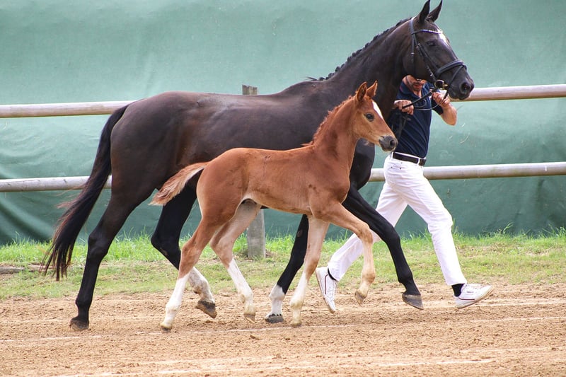 Colt by Kjento out of a state premium mare by Sir Donnerhall x De Niro. This great young athlete impresses with a beautifully upwardly modeled conformation, lots of shoulder freedom and a beautiful face. Her dam Sissy was in the collection of the Hanoverian Riding Horse Auction, won dressage and riding horse tests, was successful at the "Herwart von der Decken Show" and received the state premium. She has a character of gold and, in addition to breeding, serves as a training horse for youngsters and life insurance for insecure riders. Sissy passes on her great character, riding comfort and quality for everything required in the dressage arena to her offspring. They can shine with victories in dressage horse competitions and awards as foals. Secure this fantastic foal as a great offer for dressage sport or with a view to breeding. "Kjeld" is bright, courageous and has a balanced character. He is people-oriented and well socialized. All foals grow up with us with a family connection, know agricultural machinery, dogs, goats and cats and are kept on huge pastures in a herd. Trade-in, exchange or installment payments are out of the question. Directly from the breeder Location 17166, MV