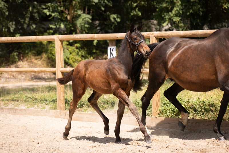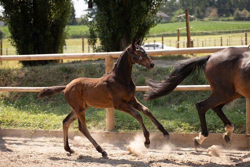 Heir of a dressage lineage, the partner of tomorrow ENTIRE Selle Français Sire: Morricone, Dam: Rudbéckia (by De Niro) Born: April 15, 2024 Dark bay Foal Results Several scores of 8 in conformation and movement – France Dressage competitions Profile Professional, knowledgeable amateur, and well-handled Disciplines Dressage, sport promotion, high-end leisure riding Temperament Approachable, curious, confident Handling Lunging, grooming, desensitization Potential Multiple scores of 8 in conformation and movement – France Dressage competitions With his refined appearance, fluid movement, and confident temperament, Orion d’Apolline embodies everything expected of a young horse destined for high-level dressage. Resulting from a carefully considered cross, he possesses remarkable genetics, which are already fully expressed through his first “France Dressage” competition. A promising foal, recognized for conformation and movement Presented at the France Dressage competition, Orion distinguished himself through the quality of his conformation and his movement. He received several scores of 8, both for his frame and for his stride, balance, and suppleness. These results confirm the obvious sporting potential of this young horse and make him a serious candidate for a successful career. His harmonious build, natural carriage, and controlled energy captivate at first glance. He draws attention with his elegance, but it is primarily his consistency, ease of movement, and engagement that suggest a bright future. Solid education, tailored for the future Like all foals born at the Aux Sources d’Apolline breeding farm, Orion benefits from a calm, respectful, and enriching environment. Our priority is to raise well-balanced foals by guiding them from a young age in their relationship with humans and their surroundings. Orion is handled daily: lunging, respect for the halter, grooming, farrier work, exposure to external stimuli. He develops a trusting relationship with humans, which will greatly facilitate his breaking-in and future development, both sportingly and socially. A partner to develop, for a future project Orion d’Apolline is ready to join a rider or professional seeking a quality young horse, well-educated, with genuine dressage aptitude. He is also an excellent choice for an amateur wishing to build a lasting relationship from the early training stages. With his confirmed potential, confident character, and natural elegance, Orion is fully aligned with breeding aimed at performance. Orion d’Apolline is available for sale. Complete veterinary examination More information, photos, and videos upon request.