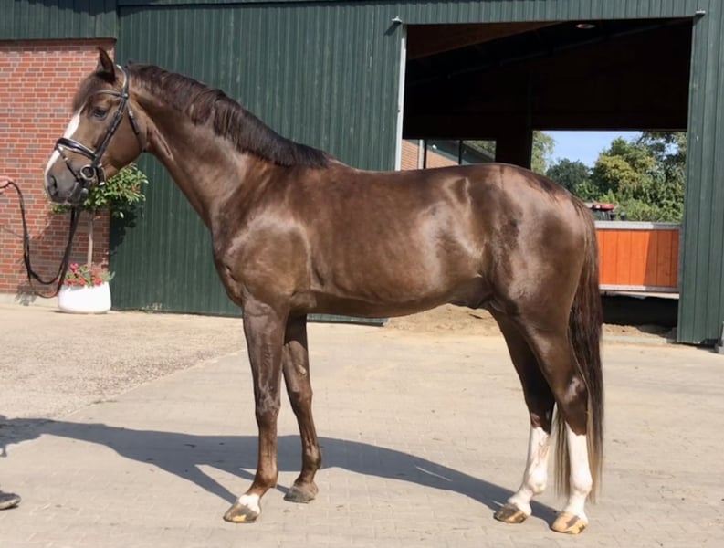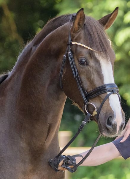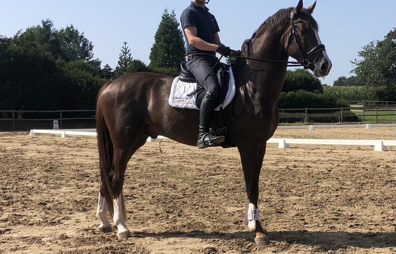 Offered is a dreamily beautiful Oldenburg dark chestnut, 3-year-old stallion registered with the Anglo European Studbook and thus freshly under saddle. Currently 172 cm tall. Sezuan’s Donnerhall x Don Gregory. Expressive, always eager to learn, motivated, and diligent. Already solid, fine to ride, and always easy to handle. His character is balanced and affectionate, attentive to people. No vices. X-ray findings without any objections. Of course, he is well-behaved for the farrier and loading. He is familiar with children, dogs, cats, tractors, etc. He is used to both open stable housing in a herd and loose housing. In the meantime, he has moved into a spacious box for training. So far, he is free from any injuries or illnesses. I am happy to send short video clips and important details via private message, but this does not replace an "on-site" viewing, getting to know him, and trying him out! Location: Germany.