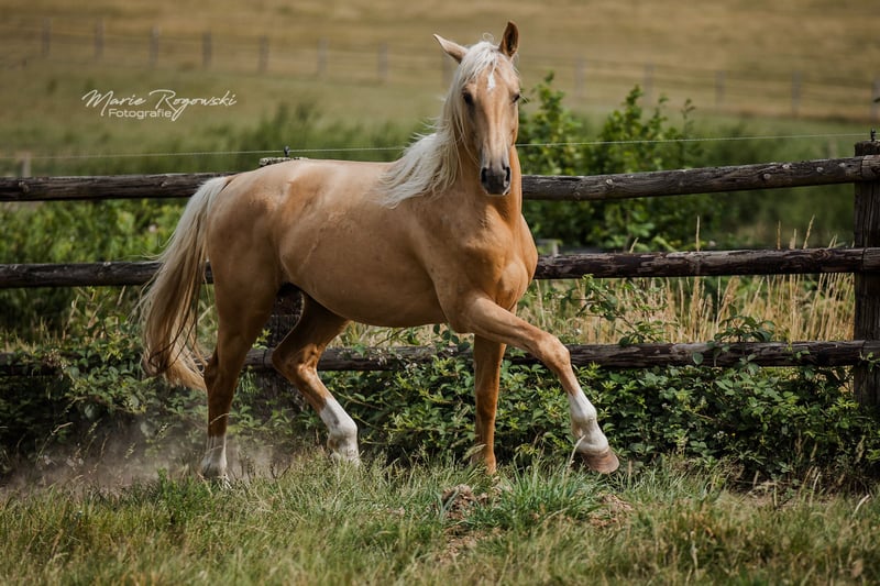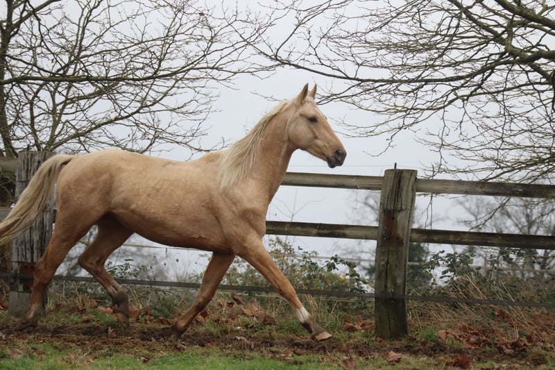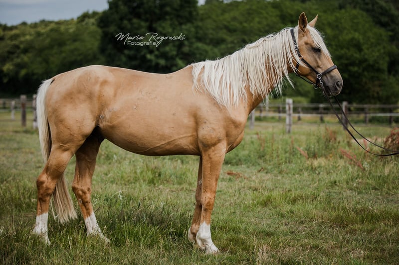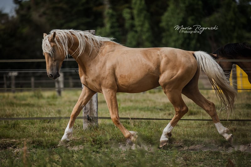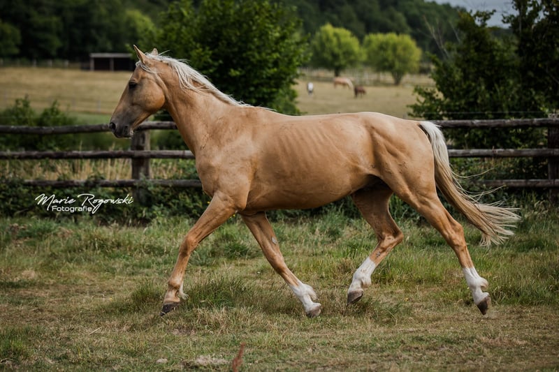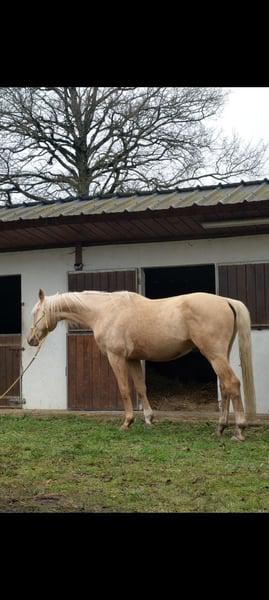 Grand étalon doré par Le Vivaldi d'une jument Cremello Hauptstammbuch par Win the Gold (Weltmeyer) avec papier Oldenburg. Élevé de manière robuste et aujourd'hui encore à l'extérieur 24 heures sur 24 et 7 jours sur 7 sur plus de 3.500 m² de refuge personnel, il est prêt pour un homme sensible qui encourage honnêtement ses qualités et fait ressortir ses talents avec ménagement. L'étalon apprend vite, communique clairement et aimablement, tout en restant calme. Il se tient en face du troupeau de poulinières et passe ainsi sa journée. Il a été brièvement débourré fin 2022, ce qu'il n'a pas trouvé difficile. En raison de changements familiaux chez le propriétaire, cela a été arrêté. Le cheval n'était pas en cause. Sabots nus, vermifugé, vacciné. Chargé plusieurs fois sans problème dans un camion sur de longues distances. Du côté paternel, qualité de la maison Gestüt Sprehe : Étalon primé issu d'une des meilleures souches de Hanovre. Étalon aux mouvements incroyablement forts et à la présentation ultramoderne. Le Vivaldi se présente avec une mécanique de mouvement enthousiasmante qui oscille constamment à travers tout le corps. Primé comme étalon lors de l'approbation hanovrienne de 2014 à Verden, il a passé avec succès le test des 30 jours à Neustadt/ Dosse en 2015. En 2017, il a passé un test sportif bien au-dessus de la moyenne à Münster/Handorf avec des notes élevées dans tous les domaines partiels. Après s'être qualifié pour le Bundeschampionat avec une note de 8,6, Le Vivaldi mûrit actuellement sous la selle de Sabine Rüben pour devenir un cheval de Grand Prix et a déjà gagné un Prix St. Georges en 2020. Jusqu'à présent, Le Vivaldi a produit des poulains de très grande qualité. Ses descendants ont été primés dans de nombreuses régions d'élevage et ont atteint des prix supérieurs à la moyenne lors des ventes aux enchères. Il a par exemple produit le poulain le plus cher lors de la vente aux enchères de poulains de Luhmühlen en 2016. Quatre de ses fils issus de la première promotion ont été approuvés. Son père Vivaldi a été champion de réserve de son HLP, a remporté la Pavo-Cup en Hollande à l'âge de cinq ans et a également gagné la finale de la série de concours KWPN pour étalons en 2009 - il y a obtenu 10,0 pour son trot. Il a connu un succès international en dressage sous la selle de Hans-Peter Minderhoud et a produit jusqu'à présent 49 fils approuvés rien que pour l'Allemagne. Sa mère Soljanka est la propre sœur du reproducteur Scolari ainsi que du vainqueur d'Intermédiaire I Solitaer 40. Le propre frère de Le Vivaldi a été l'un des prix phares de la vente aux enchères de poulains de Verden en 2016 (66.000 euros) et a été approuvé à Verden en 2018. Un troisième propre frère, baptisé Milanello, a été admis aux HLP du KWPN en 2020. La grand-mère St. Pr. St. Dynastie a été la jument championne du concours Friedrich- Jahncke en 2014 et a produit divers chevaux de dressage couronnés de succès. Elle est une fille du légendaire De Niro. La lignée de Le Vivaldis compte parmi les meilleures de l'élevage hanovrien et est entretenue par la famille Klausing à Diepholz. Un excellent travail de génération au plus haut niveau, qui se retrouve dans la qualité de la transmission d'un étalon. Du côté maternel, on retrouve la gestion d'élevage éprouvée depuis 40 ans de la maison Gestüt Falkenhorst avec une poulinière de Westphalie doublement éclairée et plusieurs fois primée (stud-book 1), dont l'origine réunit des chevaux de sport couronnés de succès dans le monde entier, a produit des étalons approuvés, ligne maternelle uniquement des juments du stud-book principal Oldenburg - Deutsches Pferd - Hessen. L'étalon peut également être approuvé ou licencié sur demande par rendez-vous à la ferme. Les acheteurs peuvent volontiers faire effectuer sur place, à leurs frais, un bilan de santé avec contrôle technique dans l'une des cliniques équines françaises des environs. Le transport est pris en charge par le vendeur. Vente privée après avoir fait personnellement connaissance. L'hébergement est gratuit.