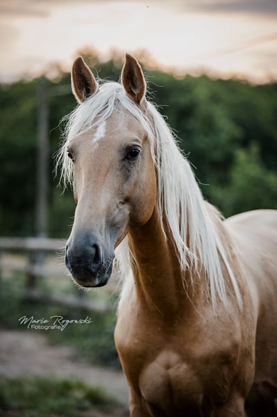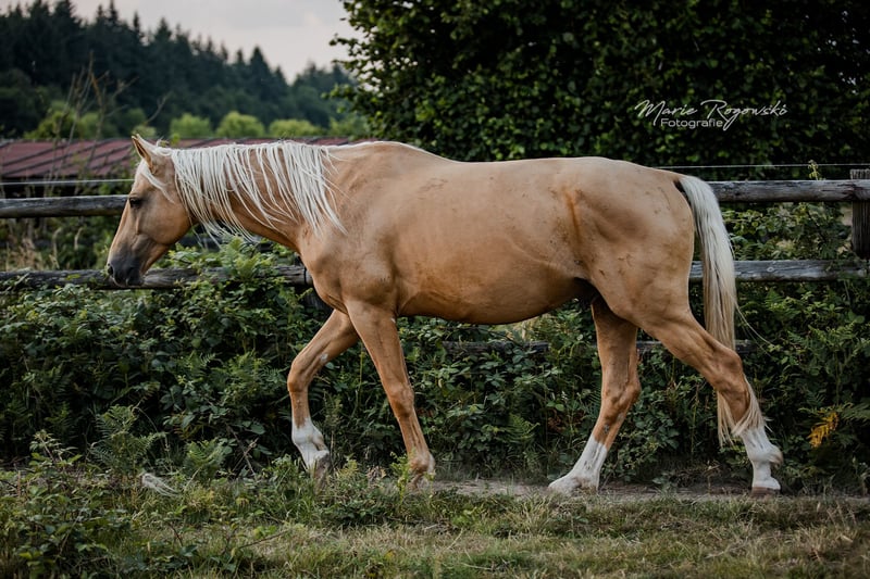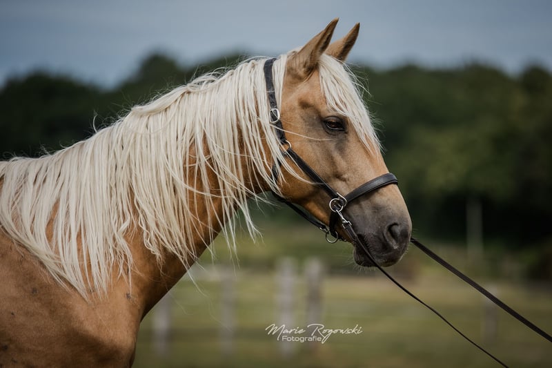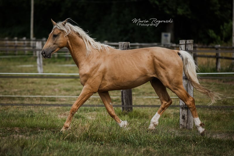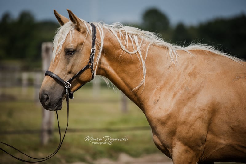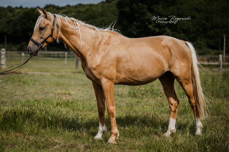 Warmblood stallion | Palomino | born 2019 | approx. 1.70 m No current studbook entry, farm licensing possible on request Genetics: e/e, Agouti not tested, CR/n LIQUID GOLD GF is friendly, attentive and very devoted to people. He is sometimes a little skittish and is looking for an experienced trainer who will encourage him with patience. Regularly dewormed, vaccinated, barehoofed, loaded on long journeys in a truck several times without any problems. The stallion has lived robustly in open country with visual contact to the mare herd since his youth. He was broken in briefly at the end of 2022 and proved to be cooperative and willing to learn. Due to family circumstances, training was not continued - this was not due to the horse. Sire: Le Vivaldi - premium stallion from Gestüt Sprehe with successful personal achievements (including Bundeschampionat qualification, Prix St. Georges), successful offspring, licensed sons and a proven Hanoverian dam line (including De Niro, Dynastie, Scolari) Dam: MACADAMIA GF - Cremello Westphalian mare, award-winning foal, related to WHITE WINE GF & WEISSGOLD GF Dam's sire: WIN THE GOLD - important sire in lightened warmblood breeding, with a dressage and jumping background