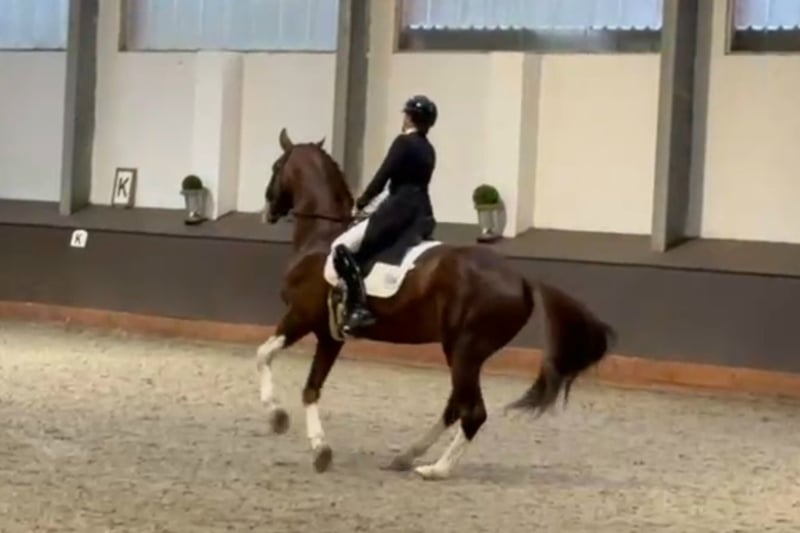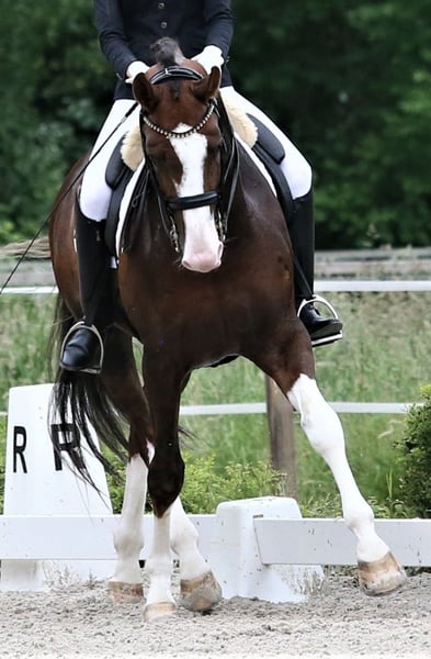 Ein Traumhengst in Choccofuchs mit viel weiß Er ist 2017 geboren, 1,74m groß, M mehrfach siegreich und S platziert. Es ist eine Freude ihn zu reiten. Bei ihm kommt viel Kraft von hinten und alle 3 GGA sind überragend. Taktsicherheit, Schwung, Bergaufvermögen, Leichtrittigkeit und aller bester Charakter...er ist als Hengst super zu händeln und totalbrav..auch auf dem Turnier.