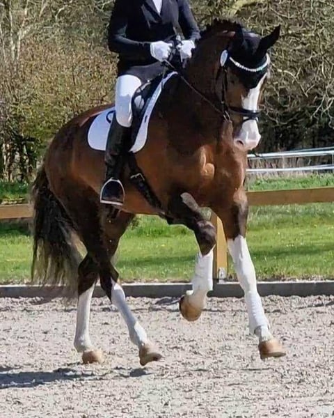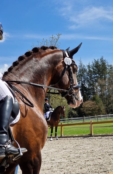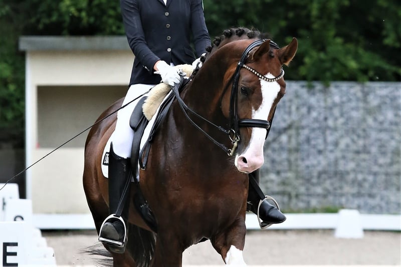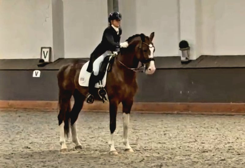 A Dream Stallion in Choccofuchs with plenty of white Born in 2017, standing at 17.4 hands, he is a multiple-winning M-level dressage horse and has achieved S-level placings. Riding him is a true pleasure. He delivers powerful impulsion from behind, and all three basic gaits are outstanding. He exhibits excellent rhythm, suppleness, uphill tendency, lightness, and an exceptional character. As a stallion, he is very easy to handle and completely well-behaved, even at competitions.
