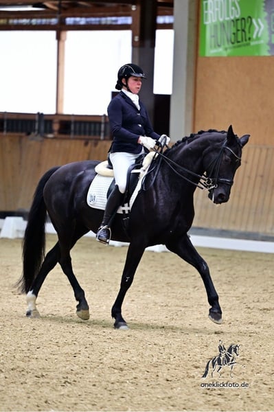 Wolke wurde auf Grund ihrer expressiven Grundgangarten sorgsam und langsam ausgebildet und ist nun bereit für neue Aufgaben im Dressurviereck. Sie ist in allen Belangen des täglichen Umgangs eine super brave und zuverlässige Partnerin. In der Arbeit ist sie nie stutig und lässt sich reiterlich einerseits „anfassen“, andererseits bewegt sie sich entspannt und stets zuverlässig und sicher in jeder fremden Umgebung, wie auch im Gelände. Sie läßt sich problemlos sowohl auf Trense als auch auf Kandare reiten. Aus diesen Gründen ist sie besonders geeignet für eine junge Reiterin, eine Dame oder für den Parasport. Sie hat L-Dressur gewonnen, ist M** hoch platziert, aktueller Ausbildungsstand ist S**- Dressur mit spektakulärer Trabtour und sehr guter/n Galopptour und (Serien-)Wechseln. Sie wird von einer Grand Prix erfolgreichen Reiterin weiter ausgebildet. Text-/Sprachnachrichten bitte ausschließlich auf Tel. Nr. 0171…. Wir beraten Sie bei einem Besuch mit Probereiten sachkompetent und nehmen uns Zeit für Sie.