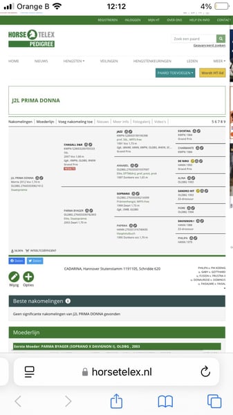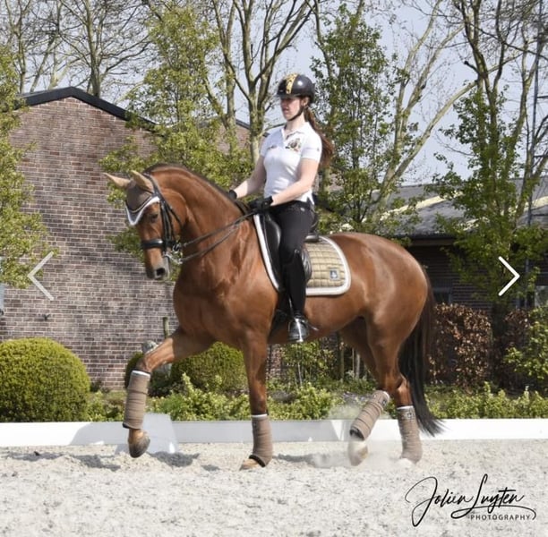 Yegua de cría, actualmente gestante de Zonik Plus. Nacida en 2012. Oldenburg. Yegua premiada por el Estado. Chagall x Soprano x Davignon. ¡Actualmente está en estado de gestación de Zonik Plus, campeón de Europa! Este año ha dado a luz un potro muy bonito de Pride. La yegua también ha obtenido colocaciones en doma hasta la categoría M y ha ganado jóvenes caballos con una puntuación de 8,0. Sin embargo, se vende como yegua de cría. Se vende por motivos de la dueña relacionados con la cría. Precio: 7.000 € VHB. El caballo actualmente se encuentra en Bélgica, cerca de la frontera alemana. Teléfono: 0031683948083 https://www.horsetelex.nl/horses/pedigree/1492919/j2l-prima-donna