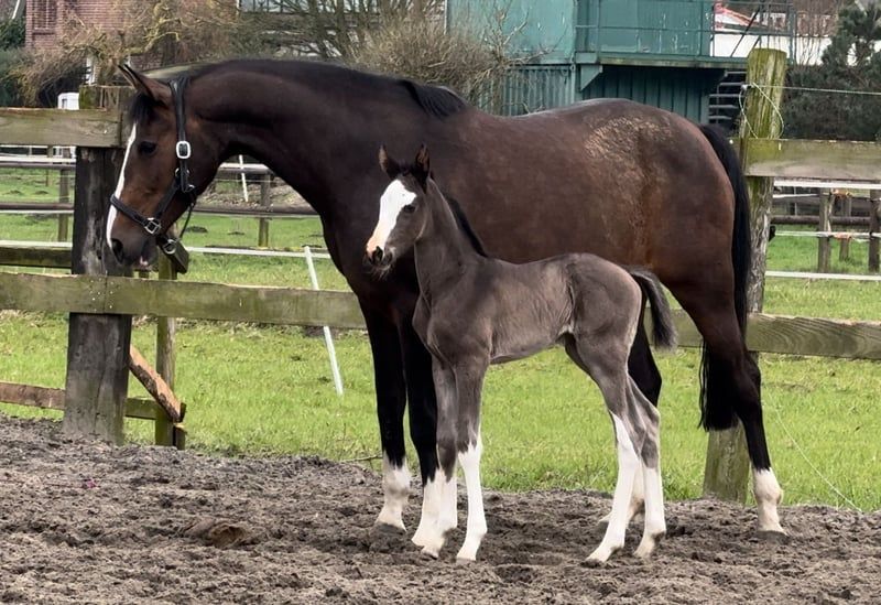 Color and double predisposition are guaranteed here! Beautiful energetic and strikingly drawn mare, carrying for 2023 by the Körsieger, HLP winner and BuCha finalist Cafe au lait, who has been attracting attention for several years with his incredibly successful breeding in dressage and show jumping. This is how Cafe's Casimir" (Cafe au lait x Calido x Grannus) was celebrated prize top of the Oldenburg elite auction, is already series winner in dressage horses M at a young age, 7 years old in his first S-dressage again series winner! He is now victorious in international Intermediaire I. Stute Kasselmanns Cafe's Caletta (Cafe au lait x Calato) is also already S-Dressage and just international Grand Prix victorious. Cafe's Matts (Cafe au lait x Don Frederico) became the second most expensive dressage horse of the Oldenburg Summer Mixed Sales. Other young horses from jumping mother mares have already been placed several times in dressage horse tests A to M and are remarkably strong in movement and head-clear. There is no question that the Cafe au lait convince offspring in show jumping up to the heavy class. So the licensed Cafe's Champus under Rene Tebbel became vice world champion of the young horses and is also in deck use with us. Also licensed and from our breeding: Cafe Junior (Cafe au lait x Silvio I), international S* jumping placed. Cafe au lait itself was under Philipp Weishaupt Bundeschampionatsfinalist and has been successful up to S*** jumping, but has also been equipped with three spectacular GGA and trained dressage at S level. Stationed at Paul Schockemöhle, he has already produced several internationally successful show jumping horses, including "Royce", victorious in the FEI CSI5* $500,000 Rolex Grand Prix Wellington. The mare herself has been presented exclusively in show jumping despite dressage descent before she switched to breeding. She has three very good GGA according to her ancestry, but was also able to collect many placements in jumping horses L. Our foals get daily mineral food and foal starters, regularly EQUISTRO Haemolytan and Ipaligo Foal, worm cures and blacksmith are of course also a matter of course. The mothers also receive special mare food throughout the pregnancy, daily juice food and linseed oil, as well as hay ad libitum. So our offspring is always in the best state of health! Other foals and young horses from our own breeding on request. A small part can be found among the other ads. With us fall every year around 20-25 Cafe au lait foals. There are also always some pregnant broodmares for sale.