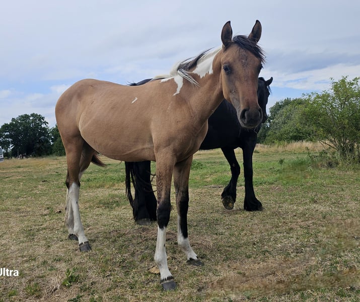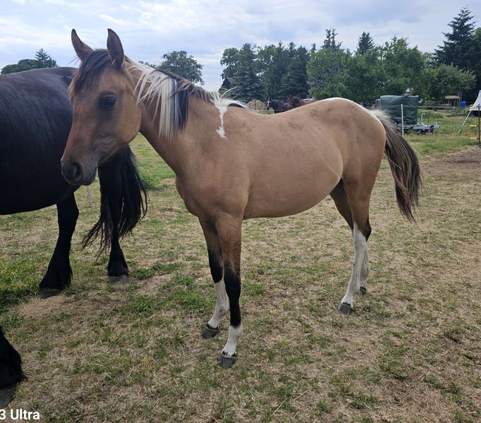 Vielversprechendes und liebevolles Stutfohlen! - Name: DC Midnight Chex - (Chilli) - Geboren am: 04.06.2024 - Mutter: Oldenburger Stute \"Miss Montana\" 1,58 m - Vater: Paint Horse Hengst \"EMH Paints Rebel Ahote\" (Grullo Tobiano, 1,55 m) - Endstockmaß 1,55-1,60 m) - Farbe: Bay Dun - Standort: 15938 Golßen Schweren Herzens muss ich mein nervenstarkes, korrekt gebautes Stutfohlen aufgrund von Zeitmangel und einer familiären Trennung abgeben. Sie wird daher günstig unter ihrem tatsächlichen Wert abgegeben. Sie besticht durch außergewöhnliche, kraftvolle Bewegungen und zeigt bereits jetzt großes Potenzial für vielseitige Western-Disziplinen, besonders Cutting und Reining. Mit ihrer neugierigen, verschmusten und lernfreudigen Art ist sie ein idealer Partner für sportliche Herausforderungen und zukünftige Ausbildungswege. Das Fohlen ist menschenbezogen, kinderlieb und hervorragend im Herdenverband sozialisiert. Sie kennt Kinder, Katzen, Hunde, Traktoren sowie alle grundlegenden Übungen des Fohlen-1x1 ? perfekte Voraussetzungen für eine unkomplizierte weitere Entwicklung. Eine tolle Chance für ambitionierte Reiter oder Züchter, die ein vielversprechendes Jungpferd zu fairen Konditionen suchen. Weitere Infos, Preis und Videos gerne per PN. Liebe Grüße aus dem Spreewald! 0159 01997146