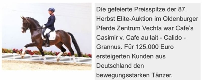 Vielversprechende Jährlingsstute aus erfolgreicher Anpaarung! Vollbruder gekört und leistungsgeprüft mit Noten bis 9,0 für Rittigkeit und Leistungsbereitschaft! So wird auch sie abstammungsgemäß klar doppelveranlagt sein und für Amateur und Profi gleichermaßen geeigent. Der Vater Cafe au lait, Siegerhengst seiner Körung, HLP Sieger und BuCha Finalist, war selbst siegreich in der schweren Klassen und hat sich in den letzten Jahren einen Namen als Doppelvererber mit Spitzennachzucht gemacht. So wurde Cafe's Casimir" (Cafe au lait x Calido x Grannus) gefeierte Preisspitze der Oldenburger Eliteauktion, ist bereits in jungen Jahren Seriensieger in S- Dressuren und international Intermediaire I siegreich. Stute Kasselmanns Cafe's Caletta (Cafe au lait x Calato) ist ebenfalls bereits S-Dressur platziert und international Grand Prix siegreich. Cafe's Matts (Cafe au lait x Don Frederico) wurde zweitteuerstes Dressurpferd der Oldenburger Summer Mixed Sales. Weitere Jungpferde aus springbetonten Mutterstuten sind bereits mehrfach in Dressurpferdeprüfungen A bis M platziert und sind bemerkenswert bewegungsstark und kopfklar. Dass die Cafe au lait Nachkommen im Springsport bis zur schweren Klasse überzeugen steht außer Frage, so zum Beispiel aus unserer Zucht: Cafe's Champus: gekört, Vizeweltmeister der jungen Pferde Cafe Junior: gekört, international erfolgreich in Saudi Arabien Cafe's Columbo: gekört und sporterfolgreich in Frankreich Cafe's Don Rubin: gekört, 4jährig als jüngstes Pferd Bronze beim Dobrocker Deisterchampionat, jetzt 5jährig mehrfach siegreich in Springpferde L, M platziert und qualifiziert zum BuCha. Cafe`s Deconi: gekört, grade 3jährig 50 Tage Leistungsprüfung mit Noten bis 9,0 abgelegt! Stationiert bei Paul Schockemöhle zeugte Cafe au lait schon etliche international erfolgreiche Springpferde, u.a. "Royce", siegreich im FEI CSI5* $500,000 Rolex Grand Prix Wellington. Cafe au lait selbst war unter Philipp Weishaupt Bundeschampionatsfinalist und ist bis S*** Springen erfolgreich gewesen, ist aber auch mit drei überdurchschnittlichen GGA ausgestattet und dressurmäßig auf S Niveau ausgebildet worden. Unsere Fohlen bekommen täglich Mineralfutter und Fohlenstarter, regelmäßig EQUISTRO Haemolytan und Ipaligo Foal. Wurmkuren und Schmied sind natürlich ebenfalls selbstverständlich. Auch die Muttertiere bekommen die ganze Trächtigkeit hindurch spezielles Stutenfutter, täglich Saftfutter und Leinöl, sowie Heu ad libitum. Daher ist unsere Nachzucht stets im besten Gesundheitszustand. Weitere Fohlen und Nachwuchspferde aus eigener Zucht auf Anfrage. Es stehen auch immer wieder einige tragende Zuchtstuten zum Verkauf. Videoanfragen etc. ausschließlich vorab über WhatsApp möglich!