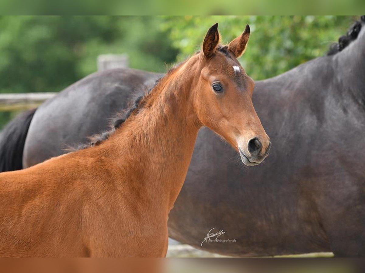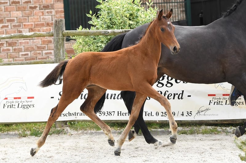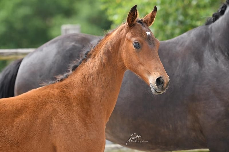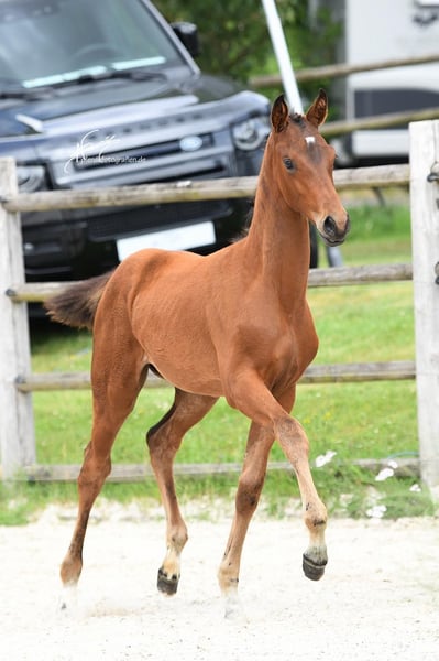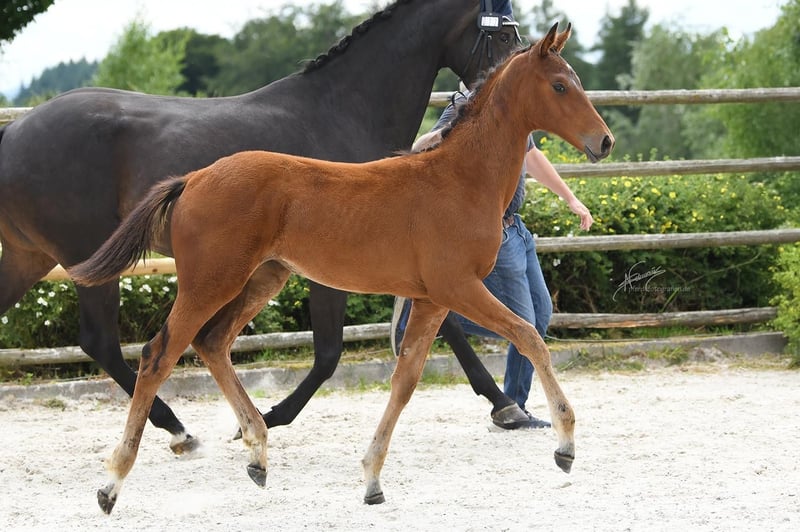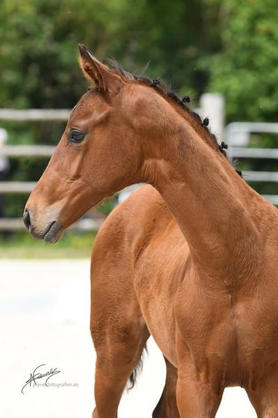 Magnifique pouliche de l'année de Vitalos, élevée par Leonie Richter, qui a brillamment été formée en tant que top cheval de dressage avec des succès lors des Championnats du Monde des jeunes chevaux de dressage. Elle est actuellement très performante dans le cadre du contingent junior avec Ava Osing. Be my lovely Princess est vraiment une princesse et apportera, que ce soit dans le sport ou en élevage, beaucoup de joie à son futur propriétaire. Elle possède trois excellentes allures de grand galop, est parfaitement sociabilisée et grandit en troupeau. La mère est la sœur complète du étalon primé Martínez, issu de la maison Ecki Wahlers. Dotée déjà d’un sang exceptionnel avec l’étalon Millennium, recherché pour sa génétique, Laurentio complète le pedigree par sa facilité de dressage. Le sang de Tetti a déjà donné de nombreux chevaux performants en élevage ou en compétition. Plus de 40 étalons issus de cette lignée ont été approuvés, parmi lesquels Coriolan v. Chronos, Goldig v. Goya, Intendant v. Inschallah AA, L'Andiamo v. Lord Liberty G, Landrebell v. Landadel, Mangun v. Miracolo xx, Orvil v. Uppercut, Rincon As v. Welt As, Winchester v. Welt As, Martinez v. Millennium, Lloyd Webber v. Laurentio, Rinconas v. Welt As – quelques exemples de cette grande lignée traditionnelle Oldenburger. Cette pouliche a la qualité pour briller dans des championnats de jeunes chevaux ou peut, en tant que véritable jument de performance, rendre son futur propriétaire très heureux. Elle n’est vendue que pour des raisons professionnelles. Ferrage, vétérinaire, etc., tout est parfaitement maîtrisé et se passe avec brio. Intéressé ? Prenez rendez-vous pour la voir. Une vidéo récente suivra.