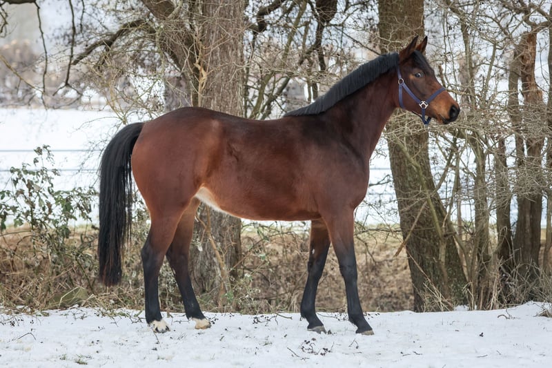Dastina est née chez nous et a été élevée dans des conditions optimales. Cette jument amicale est malheureusement devenue un peu trop petite pour nos besoins (actuellement 1,57 m). Elle est de construction robuste, bien éduquée, plutôt confiante et dominante, et repose sur un fondement correct et stable. Sa mère est la sœur utérine de Franziskus, et son père commence cette année en classe S. Dastina est manipulable en licol, se laisse charger sans problème, est sage lors du maréchage, est ferrée ou pieds nus, et vit avec deux compagnons dans un box à aire ouverte avec accès direct au paddock. Ceux qui ont le temps et l’envie de la remettre en selle eux-mêmes trouveront ici une belle jument, dotée d’un pedigree exceptionnel, à un prix abordable, et qui a déjà été contrôlée en bonne santé (têtue).