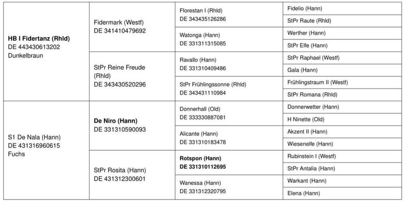 Fidertanz - De Niro da klinget es bei jedem Dressurreiter in den Ohren. Rittigkeit und Leistungsbereitschaft par excellence, denn all das ist heute wichtiger denn je. Die Stute verfügt über drei sehr gute GGA. Sie ist brav im Umgang, kennt Schmied und Hänger fahren. Als Fohlen wurde sie mit der Oldenburger Prämie bedacht. Eine tolle Stute für Zucht und Sport. Der Hannoveraner Stamm der Nikaza brachte GP Pferde, internationale VS Pferde, gekörte Hengste und hochpreisige Auktionsfohlen wie u.a : Fürst Impression Deparon Robbespierre Golden Choice DC FRH Serve Well A Boy Toy Dionysos Zauberer Friedrich der Große Dettori Zentinel Ein TÜV erfolgt Ende März, daher ist der Preis aktuell Verhandelbar. Sobald Derena in Arbeit geht steigt der Preis nach Ausbildungsstand. Die AKU ist ohne Befund. Bei Interesse gerne melden und einen Termin vereinbaren. Video wird bei Bedarf zugeschickt.