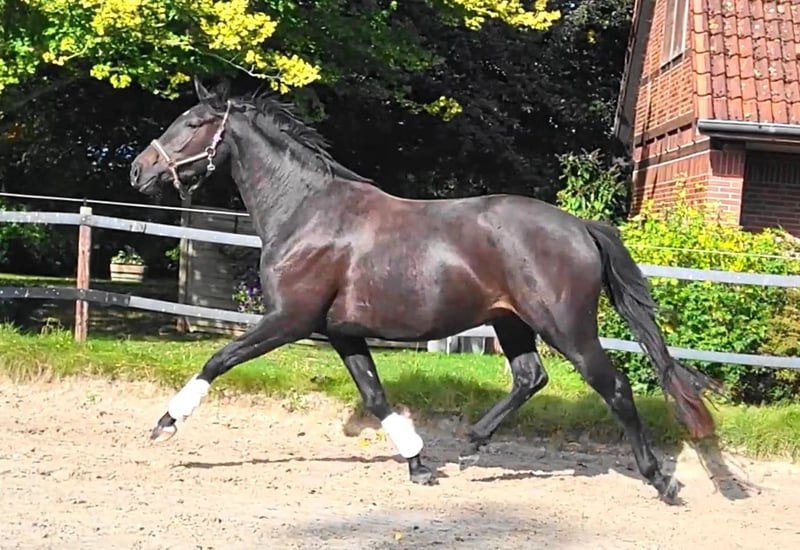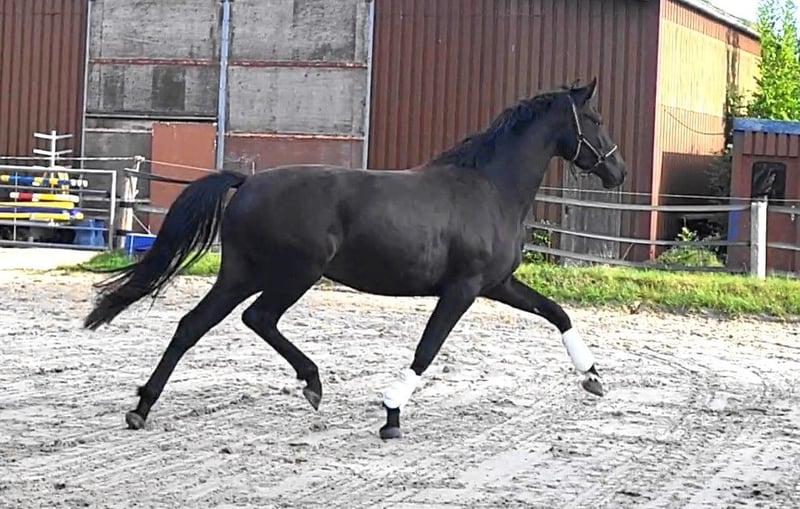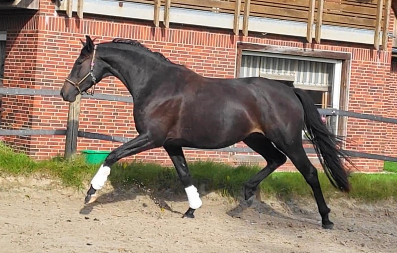 Wir haben eine rohe dreijährige Stute (geb. am 01.06.2022) aus eigener Zucht zu verkaufen. Sie ist schwarzbraun, misst zur Zeit ca. 1,70 und stammt ab vom Goldberg. Die Stute hat drei ausdrucksstarke Grundgangarten und viel Schub aus der Hinterhand. Sie ist sehr umgänglich und menschenbezogen. Derzeit läuft sie auf Sommerweide. .Die Mutter - Staatsprämienstute On my way T (Stedinger/Cartusch)- hat eine tolle Leistungsprüfung absolviert und war bis zum Zuchteinsatz erfolgreich im Sport: Reitpferdeprüfungen gewonnen und hoch platziert, Dressurpferde-A platziert. Aus dem Stamm kommen u.a. die Grand Prix-Pferde: Falcao OLD (Victoria Max-Theurer)und Lamarc WRT (Sabine Becker), sowie der gekörte Hengst For Edition (HLP-Sieger)