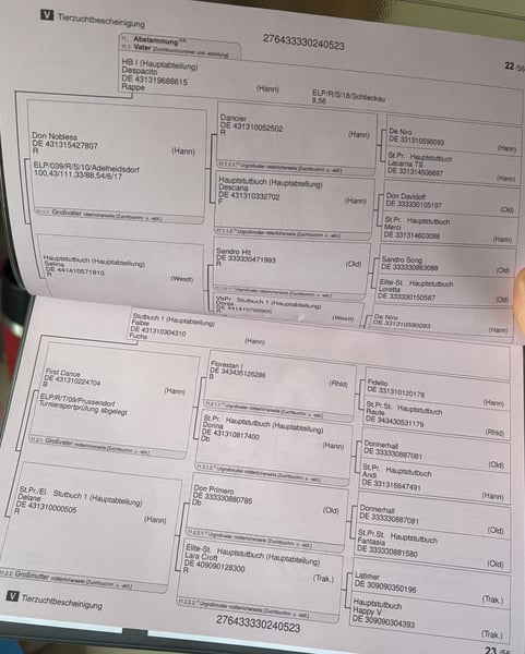 „Da Vida“ ist eine fast dreijährige bewegungsstarke Stute mit tollem Interieur. DESPACITO x FIRST DANCE x DON PRIMERO Aus der Mutter bereits der gekörte Halbbruder „Viva Dance“ (Landgestüt Warendorf) Aus der Großmutter ein in DSP gekörter Hengst v. Dynamic Dream Sie ist direkt vom Züchter und ist in der Herde aufgewachsen. Preisminderung aufgrund eines Schönheitsfehlers