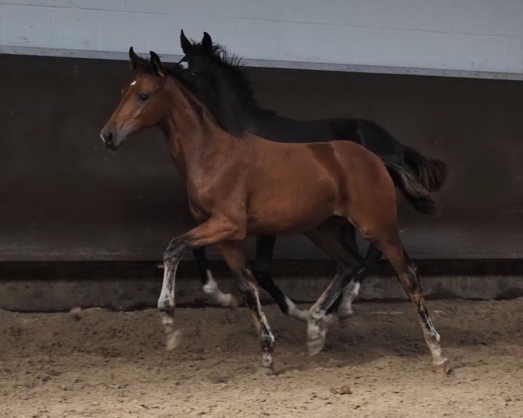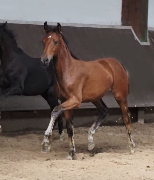 Diese typvolle früh geborene Stute überzeugt durch ihre Qualität und die äußerst interessanter Blutführung für den Dressur- und Springsport gleichermaßen! Ihr gekörter Vollbruder absolvierte grade seinen 50 Tage Test mit Noten bis 9,0! Vater "Cafe au lait", Körsieger, HLP-Sieger und BuCha Finalist, machte sich die letzten Jahre einen Namen durch seine äußerst erfolgreiche Nachzucht im Dressur- und Springsport der schweren Klasse gleichermaßen. So wurde Cafe's Casimir" (Cafe au lait x Calido x Grannus) gefeierte Preisspitze der Oldenburger Eliteauktion, ist bereits in jungen Jahren Seriensieger in S- Dressuren und international Intermediaire I siegreich. Stute Kasselmanns Cafe's Caletta (Cafe au lait x Calato) ist ebenfalls bereits S-Dressur platziert und international Grand Prix siegreich. Cafe's Mats (Cafe au lait x Don Frederico) wurde zweitteuerstes Dressurpferd der Oldenburger Summer Mixed Sales. Weitere Jungpferde aus springbetonten Mutterstuten sind bereits mehrfach in Dressurpferdeprüfungen A bis M platziert und sind bemerkenswert bewegungsstark und kopfklar. Dass die Cafe au lait Nachkommen im Springsport bis zur schweren Klasse überzeugen steht außer Frage. So wurde der gekörte Cafe's Champus unter Rene Tebbel Vizeweltmeister der jungen Pferde und steht ebenfalls bei uns im Deckeinsatz. Ebenfalls gekört und aus unserer Zucht: Cafe Junior (Cafe au lait x Silvio I), international S*-Springen platziert. Cafe's Columbo (Cafe au lait x Belstaff) : sporterfolgreich in Frankreich. .Cafe's Don Rubin: gekört, 4jährig als jüngstes Pferd Bronze beim Dobrocker Deisterchampionat. Jetzt 5jährig mehrfach siegreich in Springpferde L, M platziert und qualifiziert zum BuCha Cafe`s Deconi: gekört, grade 3jährig 50 Tage Leistungsprüfung mit Noten bis 9,0 abgelegt! Stationiert bei Paul Schockemöhle zeugte Cafe au lait schon etliche international erfolgreiche Springpferde, u.a. "Royce", siegreich im FEI CSI5* $500,000 Rolex Grand Prix Wellington. Cafe au lait selbst war unter Philipp Weishaupt Bundeschampionatsfinalist und ist bis S*** Springen erfolgreich gewesen, ist aber auch mit drei überzeugenden GGA ausgestattet und dressurmäßig auf S Niveau ausgebildet worden. Unsere Fohlen bekommen täglich Mineralfutter und Fohlenstarter, regelmäßig EQUISTRO Haemolytan und Ipaligo Foal, Wurmkuren und Schmied sind natürlich ebenfalls selbstverständlich. Auch die Muttertiere bekommen die ganze Trächtigkeit hindurch spezielles Stutenfutter, täglich Saftfutter und Leinöl, sowie Heu ad libitum. So ist unsere Nachzucht stets im besten Gesundheitszustand! Es stehen auch immer wieder einige tragende Zuchtstuten zum Verkauf, ein Teil ist unter den weiteren Anzeigen zu finden. Bei passenden Pedigree Inzahlungnahme von Zuchtstuten möglich. Videoanfragen ausschließlich vorab via WhatsApp möglich. Cafe`s Devina verfügt bereits über aktuelle sehr gute Röntgenbilder