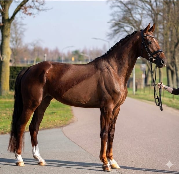 Youngster für das große Viereck: 4-jährige Dressurstute mit Perspektive (1,71 m) Talent für das große Viereck: 4j. Fuchsstute „Lady“ (1,71 m) Zum Verkauf steht Lady, eine hochveranlagte 4-jährige kohl Fuchsstute mit einem Stockmaß von ca. 1,71 m. Diese Nachwuchshoffnung vereint eine erstklassige Abstammung mit einer Bewegungsqualität, die sie klar für die schwere Klasse prädestiniert. Lady kommt direkt vom Züchter zu uns und befindet sich seit ca. drei Monaten unter dem Sattel und zeigt sich dort überdurchschnittlich arbeitsbereit und kopfklar. Seitengänge und Trab-Galopp Verstärkung begonnen. Lady überzeugt durch: Enormes Bewegungstalent! Eine echte Tänzerin mit viel Show in der Bewegung. Zudem zeigt sie eine aktive Hinterhand und gewaltiger Schubkraft, vereint mit Versammlungsbereitschaft! Bergauf-Galoppade: Von Natur aus mit viel Tragkraft und Balance ausgestattet. Interieur: Viel schulterfreiheit bei gleichzeitig hoher Rittigkeit und Fokus auf den Reiter. Gesundheit & Transparenz Für maximale Sicherheit liegt ein aktueller, sauberer TÜV vor: 22 Röntgenbilder (inkl. Nacken und Rücken). Komplett ohne Befunde. Lediglich ein Huf von ihr ist aktuell noch leicht "Bockhuf". Sie hat nun das 2. Mal Eisen drunter und wir gehen davon aus dass die "fehlstellung" komplett zu beheben ist. Lady ist eine hocheffiziente Investition für den professionellen Sport. Wer eine junge Stute mit Ausstrahlung und korrektem Fundament sucht, wird hier fündig. Standort: Region Venlo / NRW Preis: Der Qualität entsprechend auf Anfrage. Pk 15-25.000 Videos und Details zur Abstammung senden wir Ihnen gerne bei ernsthaftem Interesse zu.