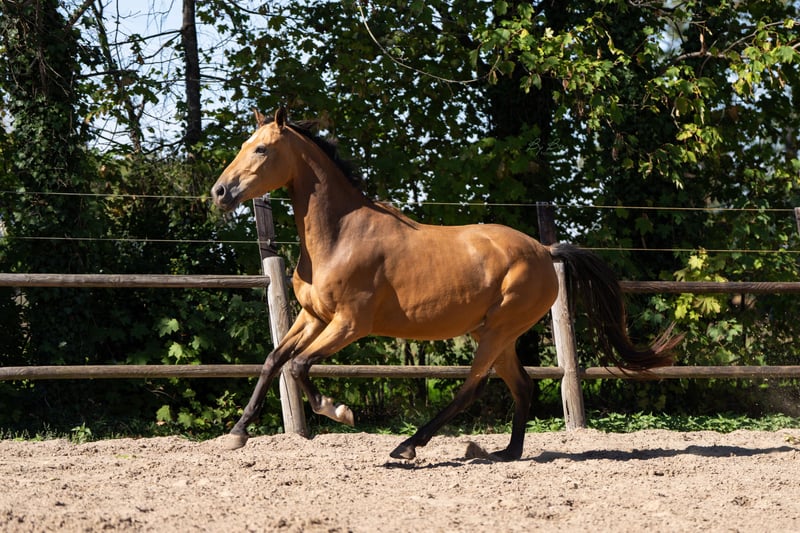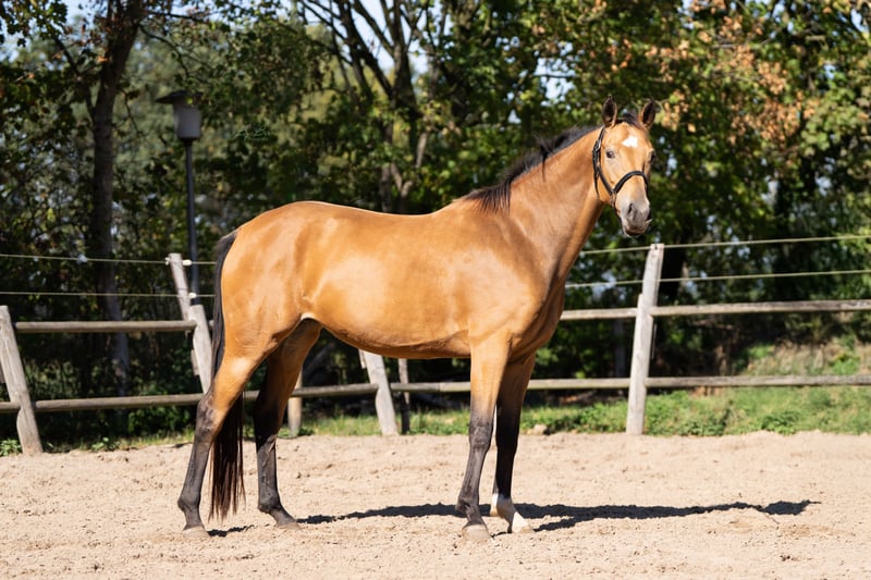 Sehr brave, talentierte vierjährige Stute. Seit einigen Monaten unter dem Sattel und nimmt die Arbeit sehr positiv auf. Mit ihrer falbfarbenen Fellfarbe und korrekter Konstitution wird sie in der Halle sicherlich eine auffällige Erscheinung sein. Sie bewegt sich mit viel Ausdruck und Antritt. Allround gezüchtet, in ihrer Abstammung sind sowohl Dressur- als auch Springlinien zu finden. Sie ist sehr lieb und anhänglich und steht mit anderen Pferden gemeinsam auf der Weide. Röntgenologisch untersucht, inklusive Hals und Rücken. Sandro's Match x Camlough Delphi